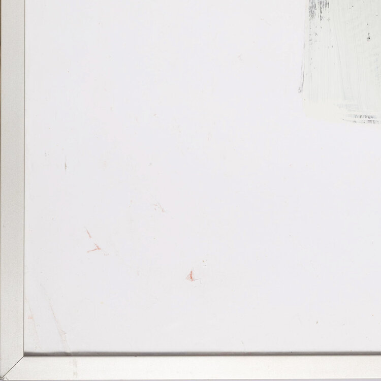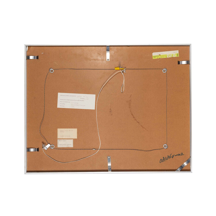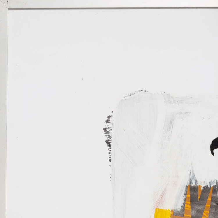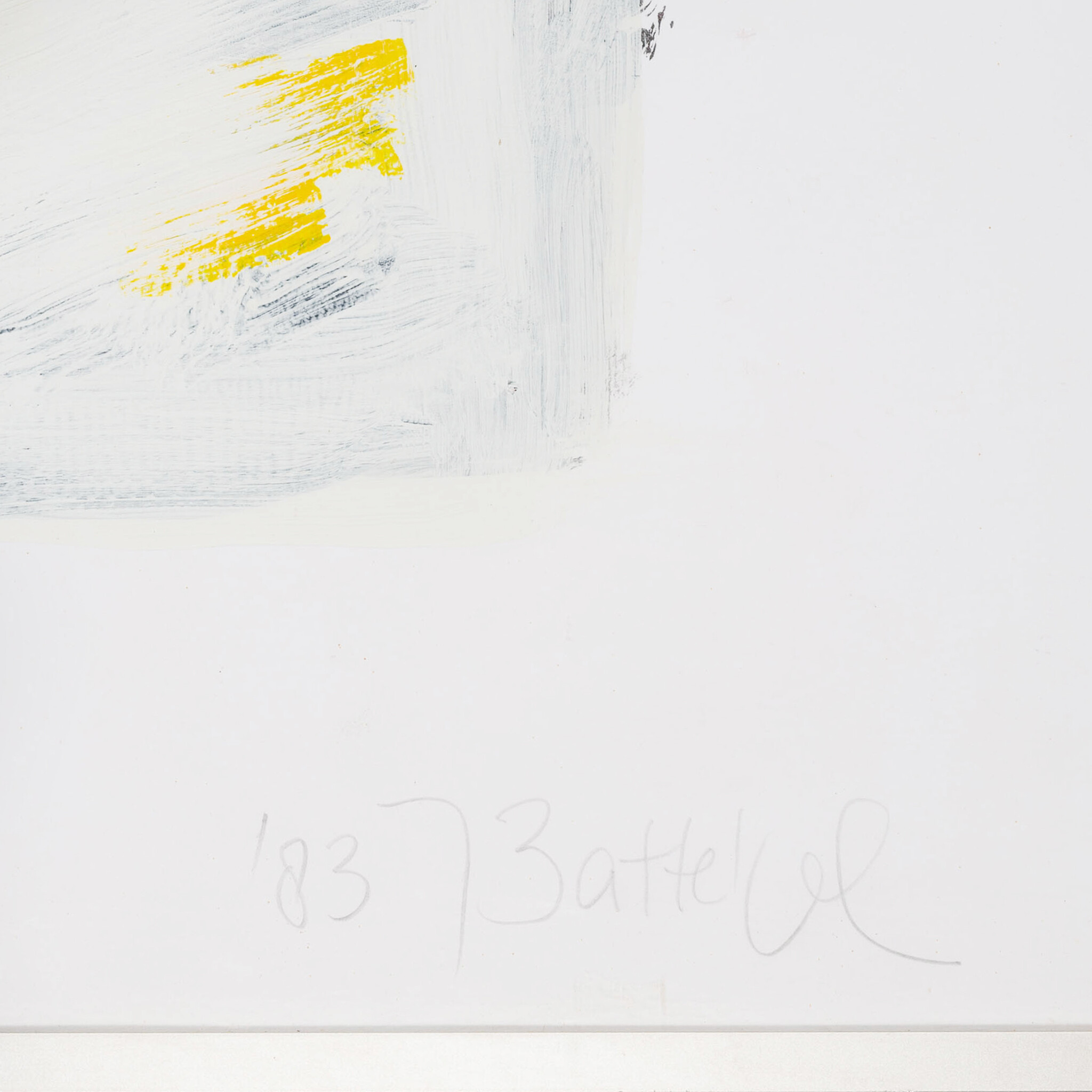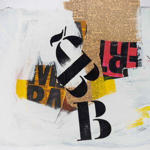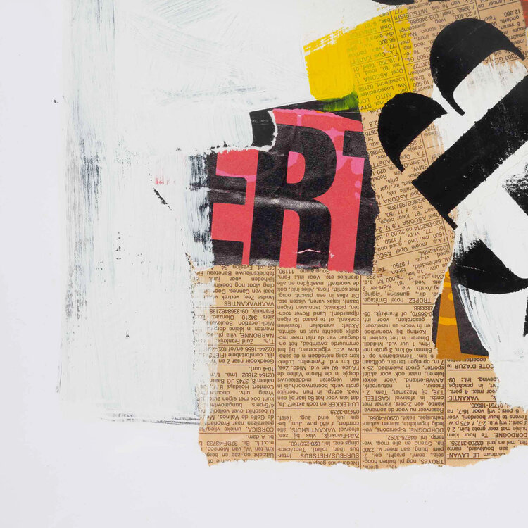 J. Batteljee, 'Without Title 6', 1983. Collage op papier met passe-partout in metalen lijst met kunststof plaat. Collage van stukken gescheurde krant waaroverheen geschilderd is met witte verf. Met sjablonen zijn hierop zwarte letters afgedrukt. Het werk heeft daarnaast rode en gele accenten. Signatuur rechtsonder. Conditie: vertoont gebruikssporen. Afmetingen incl lijst: ca 52 x 66,5 cm.