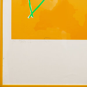 J. Christiaan Heydenrijk (Zwolle, 1947), 'Rudimentair symbool', 1989. Zeefdruk op papier in gele lijst, oplage 4/5. Abstracte compositie van een rood symbool met groen omlijnd, voor een gele achtergrond. Linksonder signatuur. Conditie: goed, enkel hier en daar lichte gebruikssporen aan de lijst. Afmetingen lijst: 100 x 72,5 cm; beeldvlak 66 x 75 cm.