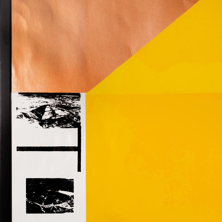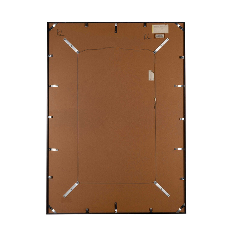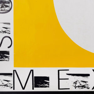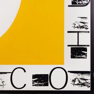 J. Klaasen, 'Zonder Titel', datering onbekend. Zeefdruk Unica 1, in zwart metalen lijst met kunststof plaat. Abstract werk met onder een groot geel vlak en boven een bruin en zwart vlak, met zwart-wit foto's van de Teohuacan in Mexico in verschillende bewerkingen. Rondom staan de letters TEOS MEXICO HUAN in zwart-wit. Signatuur ontbreekt. Conditie: vertoont gebruikssporen, beschadigingen papier. Afmetingen incl lijst: ca 116 x 83 cm.