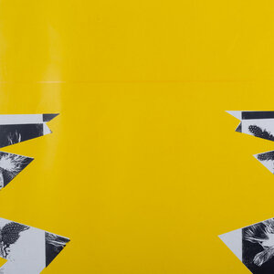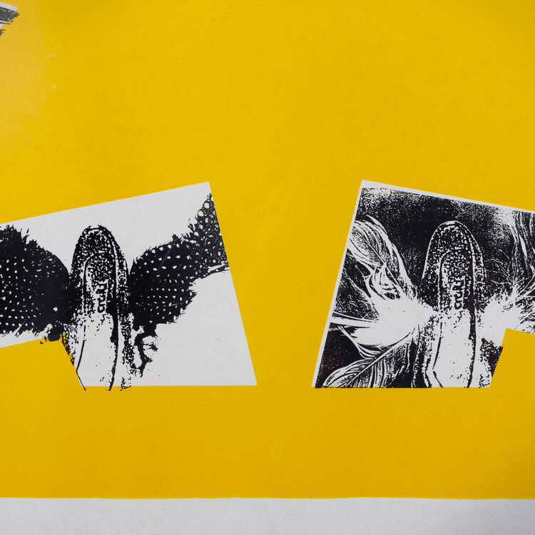 J. Klaasen, 'Zonder Titel', datering onbekend. Zeefdruk Unica 1, in zwart metalen lijst met kunststof plaat. Abstract werk van een groot geel vlak in twee tinten, met zwart-wit foto's van een schoen met veren in verschillende bewerkingen. Signatuur ontbreekt. Conditie: vertoont gebruikssporen. Afmetingen incl lijst: ca 116 x 83 cm.