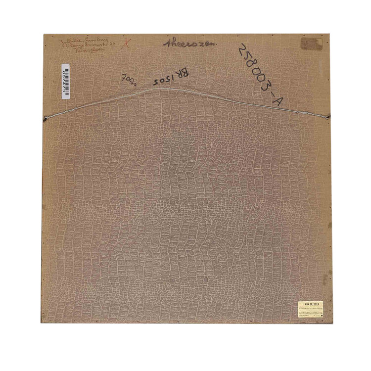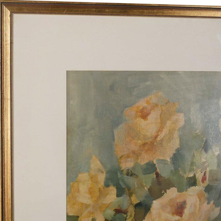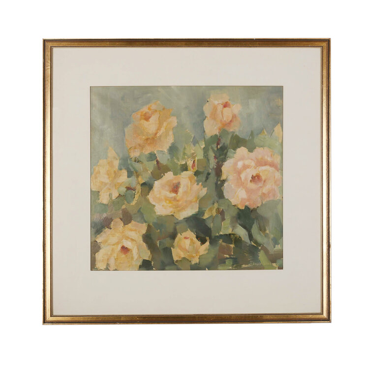 J. Muller-Limburg, Theerozen, jaartal onbekend. Aquarel op papier in goud gekleurde houten lijst. Afbeelding van licht roze rozen voor een blauwe achtergrond. Rechtsonder signatuur. Conditie: beschadigingen aan lijst. Afmeting lijst: 57 x 57 cm.