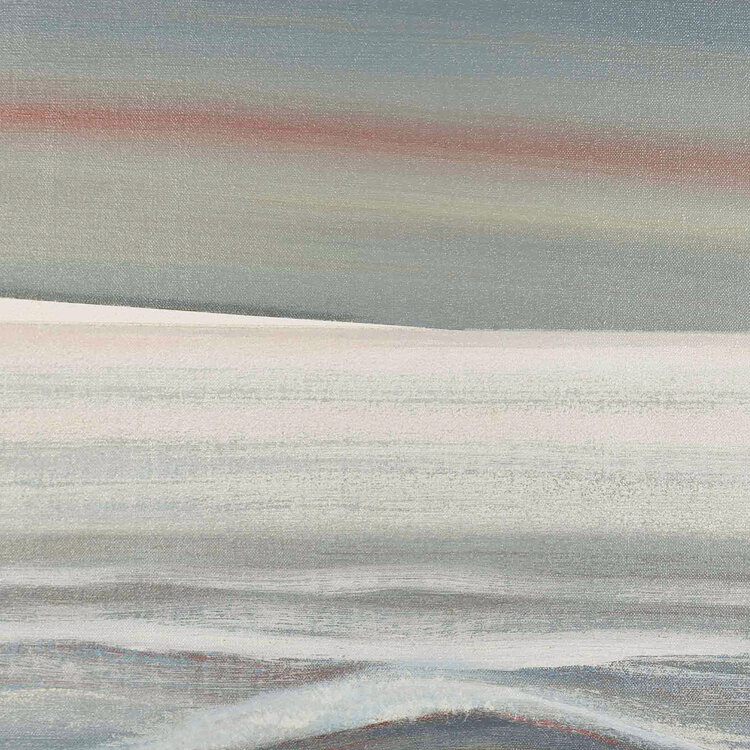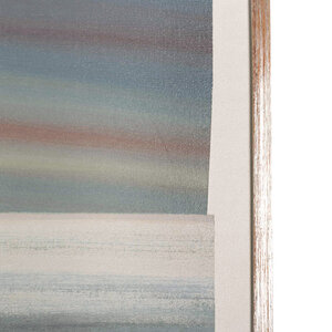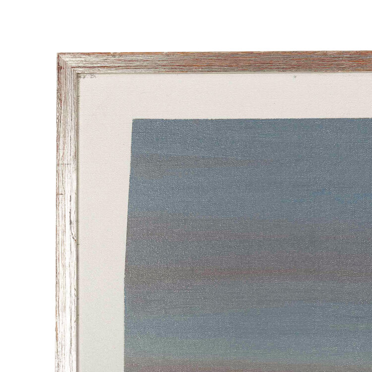 J. van Hoften, Sfeerisch landschap II, jaartal onbekend. Acryl op doek in zilverkleurige houten lijst. Abstracte compositie van twee rechthoeken met horizontale penseelstreken in blauw-wit met rode accenten. Conditie: gebruikssporen aan lijst, doek zit een beetje los. Afmeting lijst: 62 x 62 cm.