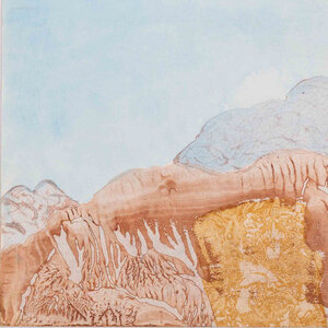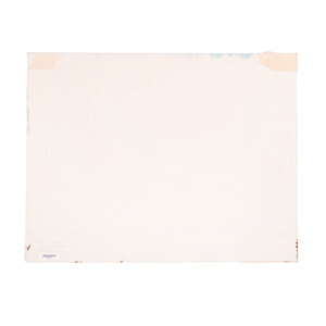 J. van Hoften, Droomlandschap, datering onbekend. Acryl op papier zonder lijst. Landschap in pastel kleuren blauw en roze, met bruin en oker kleurige details. Het werk is in prima conditie. Afmetingen: 50 x 65 cm.
