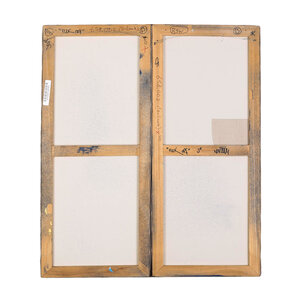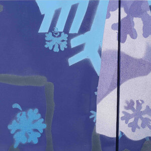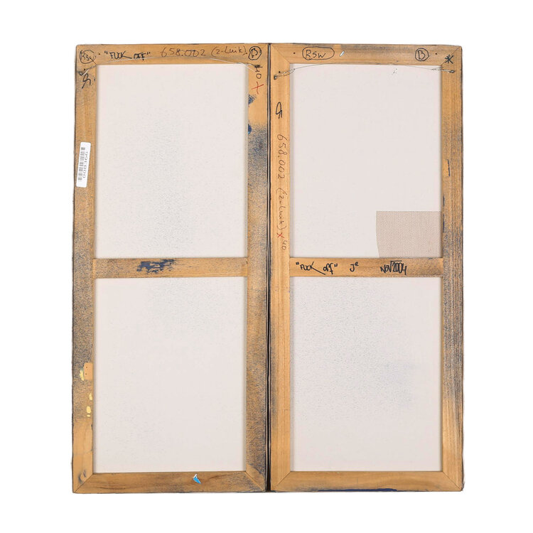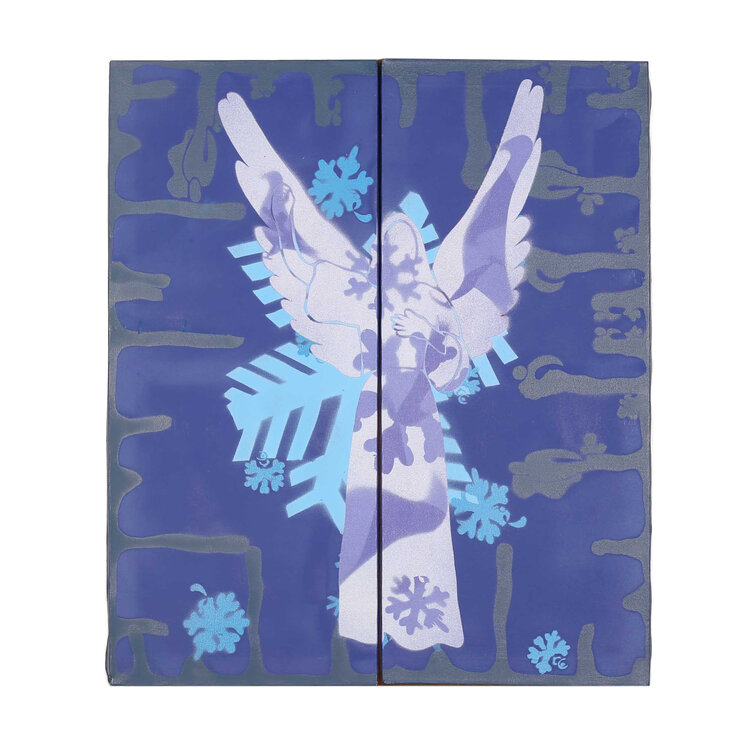 J2, Fuck off, 2004. Twee luik op doek gemaakt met stencil techniek, een techniek die vaak gebruikt word in street art. Het tweeluik tont een zilverkleurige engel tegen een donker blauwe achtergrond, en verschillende lagen van sneeuwvlokken met diverse afmetingen. Afmetingen: twee doeken 70 x 30 cm. Conditie: De werken zijn in goede conditie, wel is het linker deel gerepareerd.