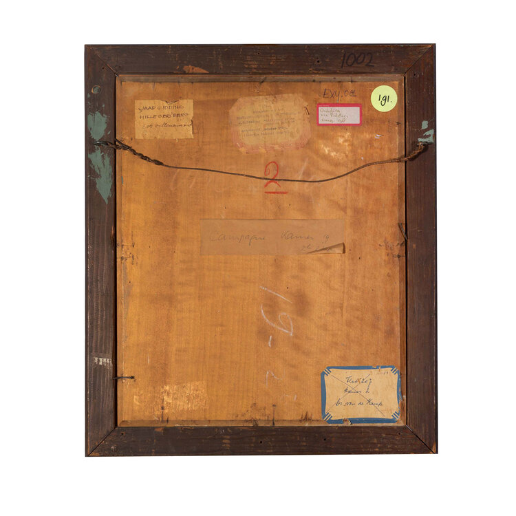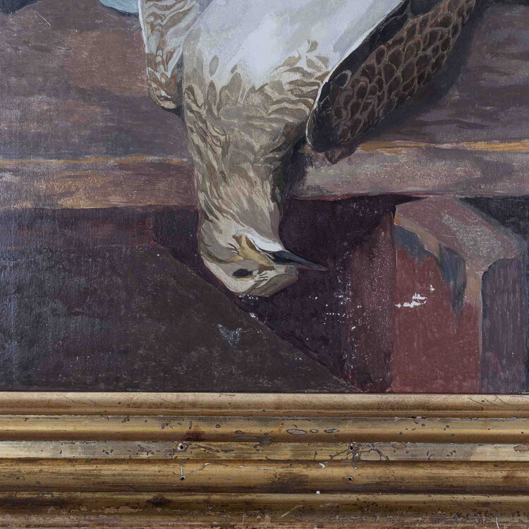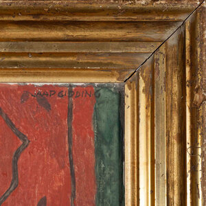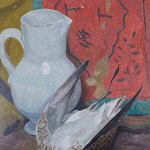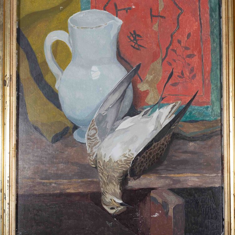 Jaap Gidding (1887-1955), 'Stilleven met witte vaas en patrijs', datering onbekend. Olieverf op doek in houten lijst. Afbeelding van een witte vaas met dode patrijs op een houten tafel, voor een rood en geel vlak. Signatuur rechtsboven. Conditie: doek zit vrij los in lijst. Afmetingen incl lijst incl lijst: ca 56 x 47 cm.