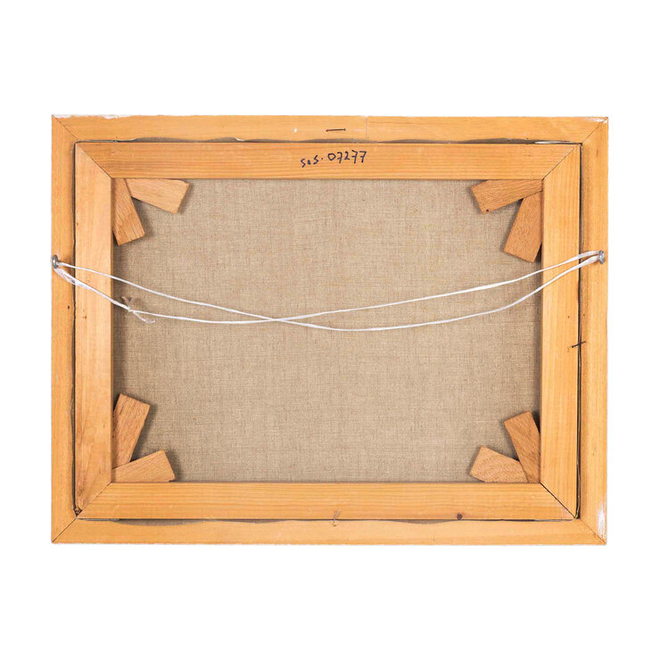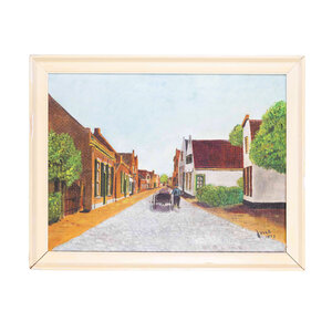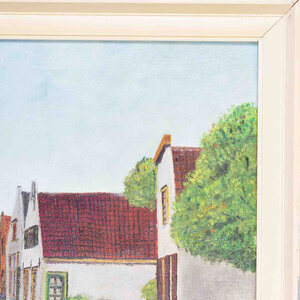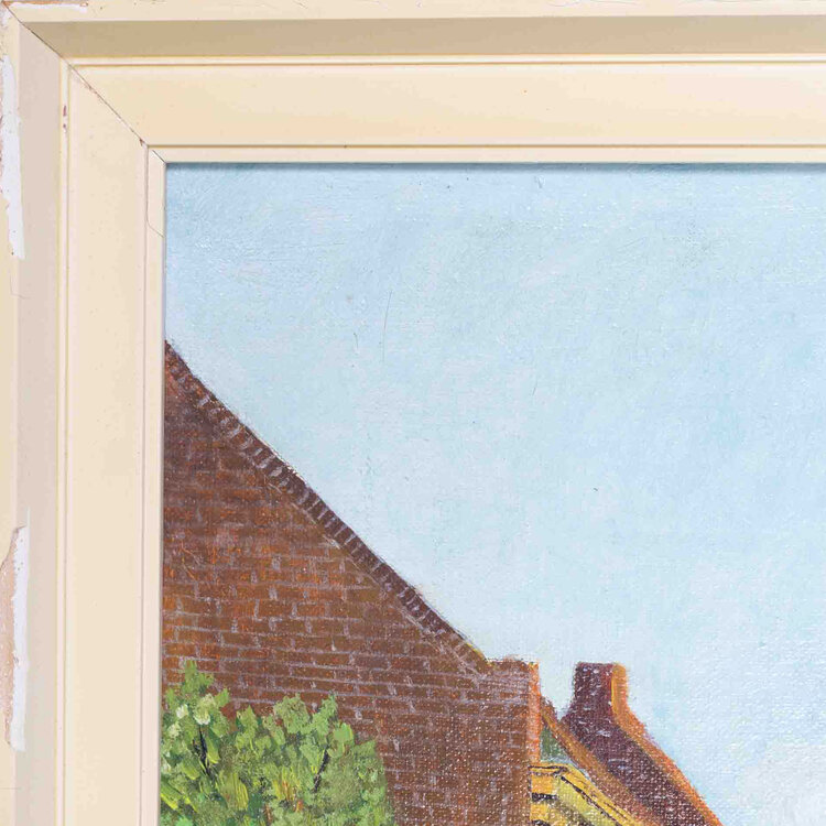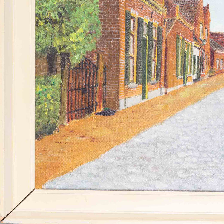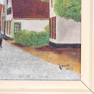 Jaap Vink, Molenstraat, 1973. Schilderij, rechthoekig olieverf op doek op spanraam in witte houten lijst. Voorstelling: Molenstraat vanaf hoek Wilhelminastraat. Midden in de straat een man met een hondenkar. Rechts onder in zwart gesigneerd: "J. Vink 1973. Conditie: goed, lijst heeft hier en daar beschadigingen en zit een beetje los. Afmetingen lijst: 35 x 45 cm.