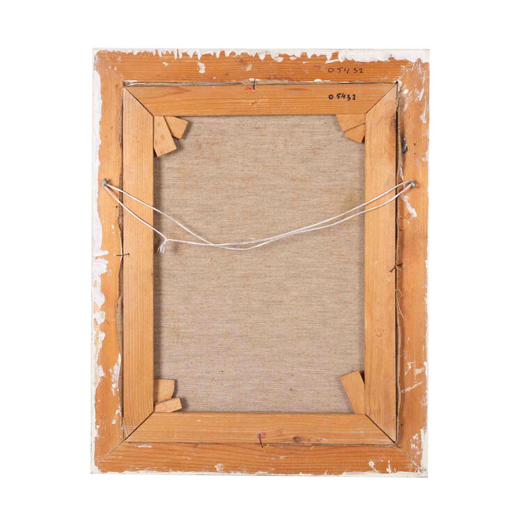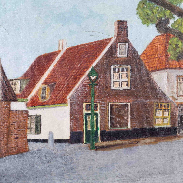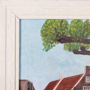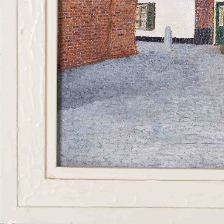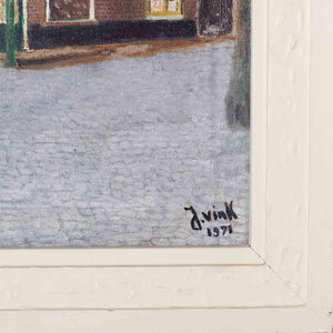 Jaap Vink, Muizensteeg, 1971. Schilderij, olieverf, rechthoekig op spanraam in witte houten geprofileerde lijst. Voorstelling van een huisje met schuine gevel met lantaarn voor deur. Heeft gestaan in muizensteeg ca 1900. Rechtsonder gesigneerd in zwart J. Vink 1971. Conditie: goed, lijst heeft hier en daar beschadigingen en zit een beetje los. Afmetingen lijst: 49 x 38 cm.