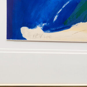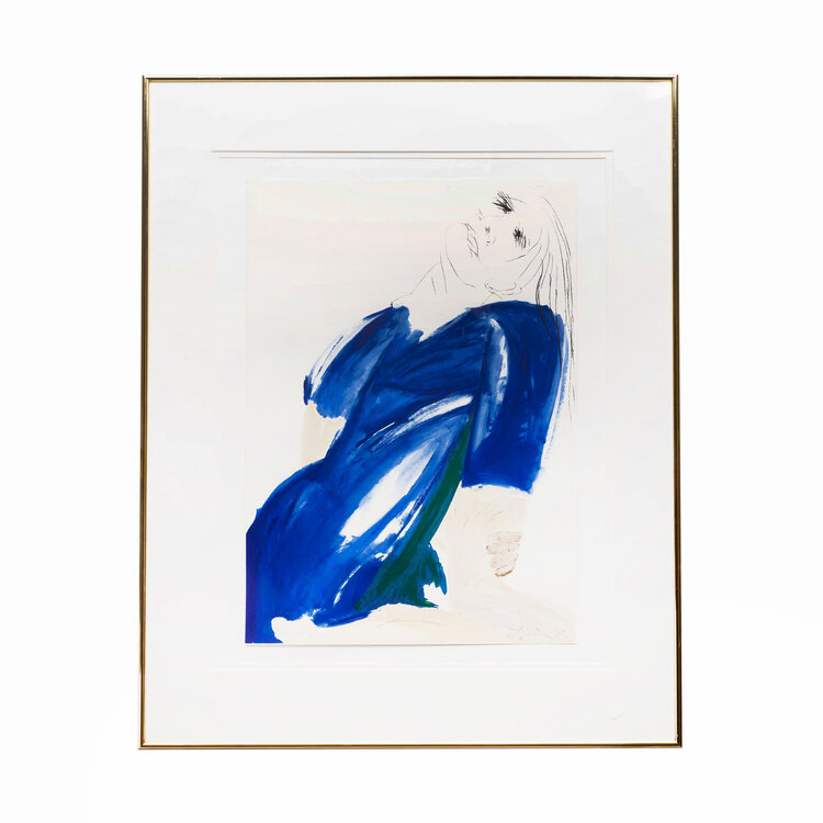 Jacqueline de Jong, 'Lady in blue', 1982. Zeefdruk oplage 182/200. Portret van een vrouw met blauwe jurk. Linksonder oplagenunmmer, rechtsonder signatuur en jaar. Dit werk is afkomstig uit de kist ’20 Nederlandse Hedendaagse kunstenaars’ die in 1982 door G.I.N. Gallery in Amsterdam is uitgegeven. Het werk is ingelijst achter museumglas met passe-partout. Conditie: goed, enkel lichte gebruikssporen aan de lijst en rechtsonder de restanten van een stickertje op het gals. Afmeting: 102 x 81 cm.
