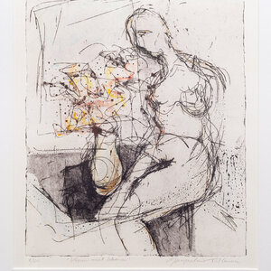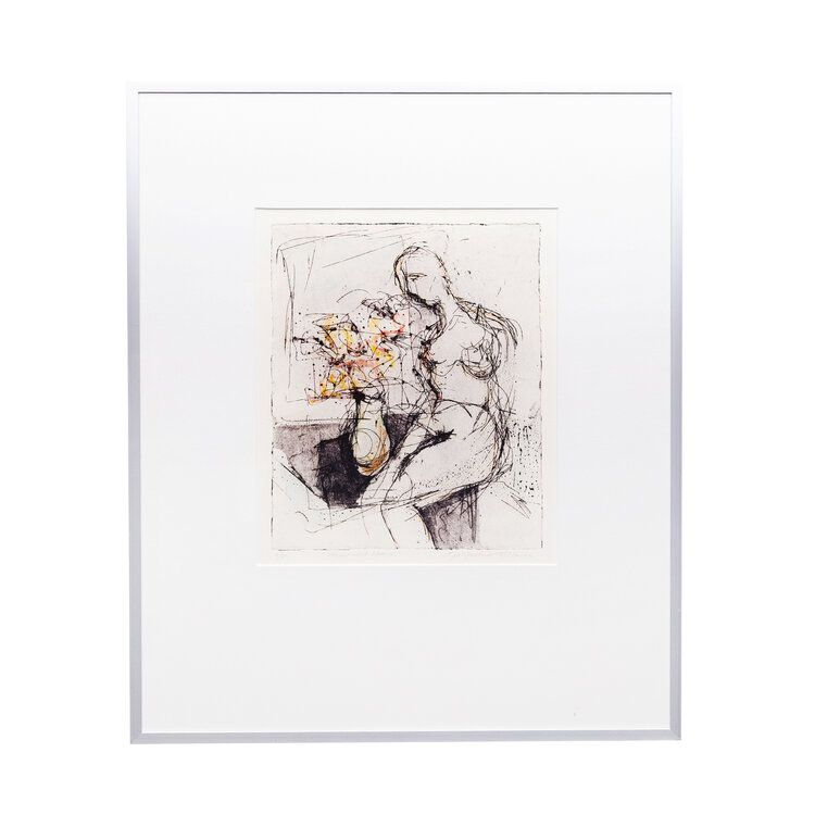 Jacqueline Tollenaar, 'Vrouw met bloemen'. Ets/aquatint, oplage 2/25, in metalen lijst met passe-partout. Zwart-wit afbeelding van een vrouwfiguur in lijnen zittend naast een vaas met bloemen met rode en gele accenten. Signatuur rechtsonder. Datering onbekend. Conditie: gebruikssporen lijst. Afmetingen lijst: 60,5 x 50,5 cm; beeldvlak: 29,5 x 24,5 cm.
