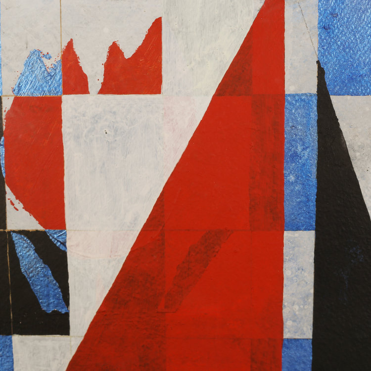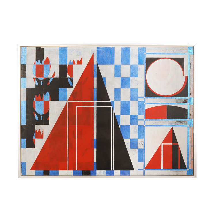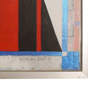 Jacques van Dorst, Hollands landschap, 1992. Acryl op papier in metalen lijst. Voorstelling met geometrische vormen en tulpen in rood, wit, blauw en zwart. Conditie: goed, gebruikssporen aan lijst. Afmeting: 60 x 80 cm.