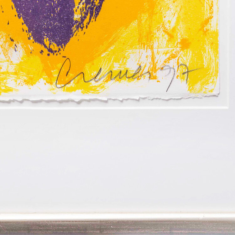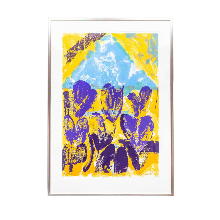 Jan Cremer, 'Blue mountain', 1997. Zeefdruk op papier in zilverkleurige lijst, oplage 54/60. Abstracte voorstelling van paarse tulpen voor een gele achtergrond met een blauwe driehoekige berg. Linksonder oplagenummer, rechtsonder signatuur en jaar. Conditie: goed. Afmeting werk: 120 x 80 cm, lijst: 147 x 104 cm.