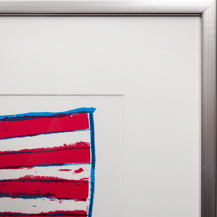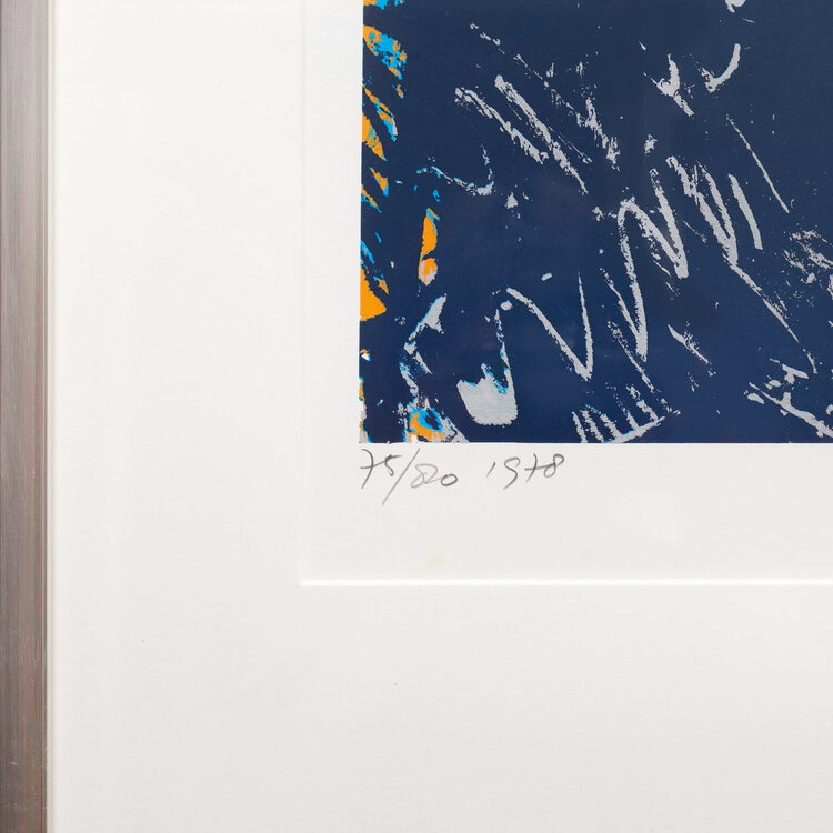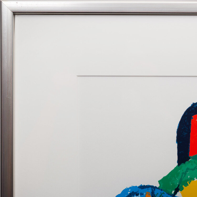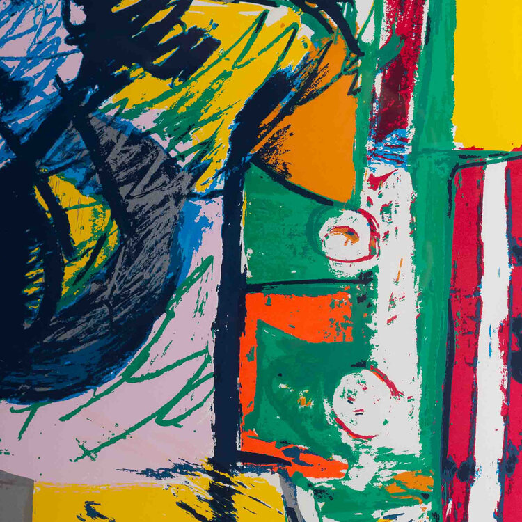Jan Cremer, 'Fidel Castro in the Bush', 1987. Zeefdruk in zilverkleurige lijst, oplage 75/80. Kleurrijke abstracte compositie waar rechtsboven de Amerikaanse vlag te zien is. Linksonder oplagenummer en jaar van de druk, rechtsonder signatuur en jaar van originele werk. Conditie: goed, lichte gebruikssporen aan lijst. Afmeting lijst: 90 x 71 cm.