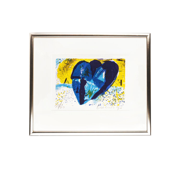 Jan Cremer, 'Hommage a Fanny Ardant II', 1993. Kleurenlitho in zilverkleurige lijst, oplage 52/60. Abstracte voorstelling met twee blauwe hartvormen voor een gele achtergrond. Linksonder oplagenummer, rechtsonder signatuur en jaar. Conditie: goed, lichte gebruikssporen aan lijst. Afmeting lijst: 50 x 60 cm.