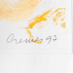 Jan Cremer, 'Sahara I', 1997. Zeefdruk in zilverkleurige lijst, oplage van 60. Abstracte voorstelling met drie zwarte hartvormen voor een gele achtergrond. Linksonder oplagenummer, rechtsonder signatuur en jaar. Conditie: goed, lichte gebruikssporen aan lijst. Afmeting lijst: 81 x 100 cm.