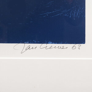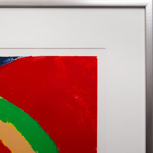 Jan Cremer, 'Shooting Gallery', 1987. Zeefdruk in zilverkleurige lijst, oplage 75/80. Compositie van een schietschijf voor een blauw-rode achtergrond. Linksonder oplagenummer en jaar van de druk, rechtsonder signatuur en jaar van originele werk. Conditie: goed, lichte gebruikssporen aan lijst. Afmeting lijst: 90 x 71 cm.