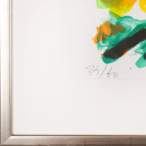 Jan Cremer, 'Toscane 02', 2000. Kleurenlitho in zilverkleurige lijst, oplage 33/60. Kleurrijke voorstelling van een heuvellandschap met rechtsvoor een cipres in zwart, groen, oranje en geel. Linksonder oplagenummer, rechtsonder signatuur en jaar. Conditie: goed, minimale gebruikssporen aan lijst. Afmeting lijst: 66 x 81 cm; beeldvlak: 36 x 51 cm.