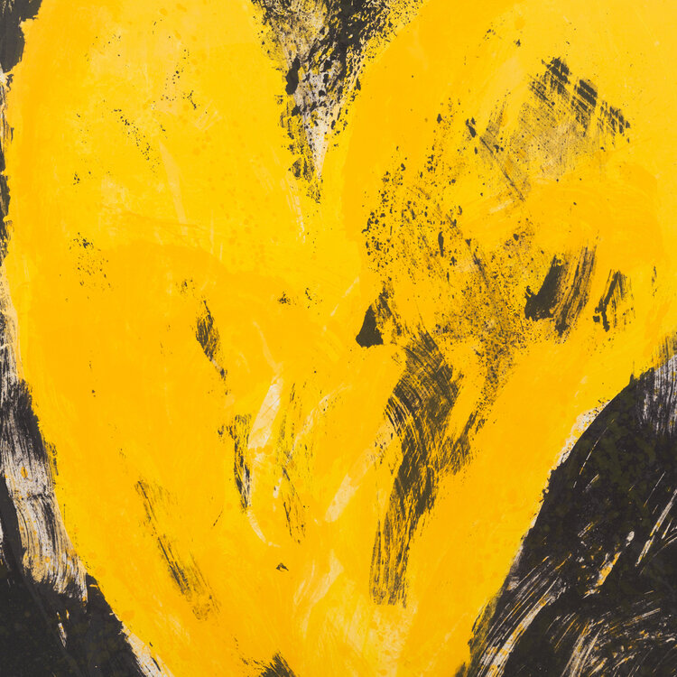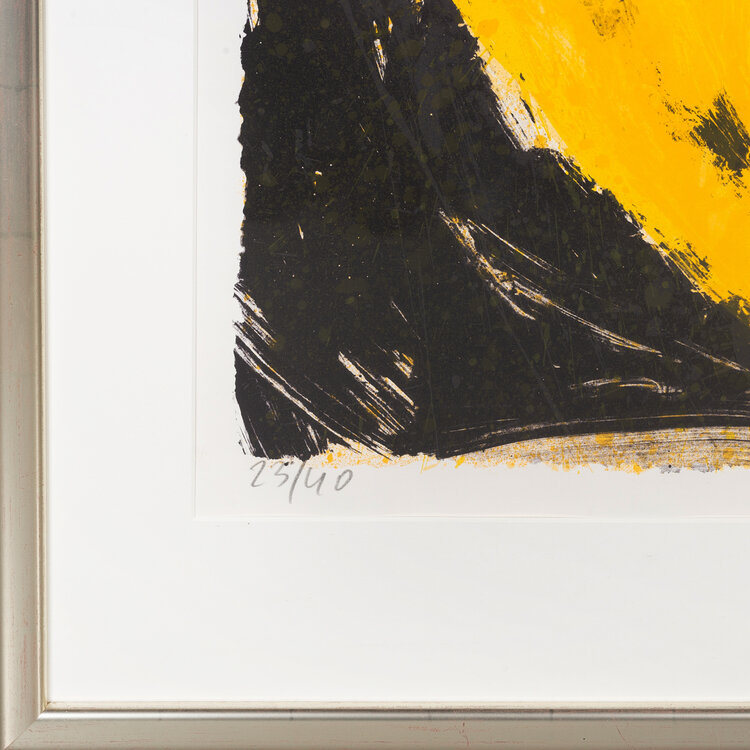 Jan Cremer, 'Yellow Tulip', 1992. Litho, oplage 25/40. Abstracte voorstelling van een gele tulp voor een zwarte achtergrond. Linksonder oplagenummer, rechtsonder signatuur en jaar. Conditie: lijst vertoont gebruikssporen. Afmetingen incl lijst: 122 x 94 cm.