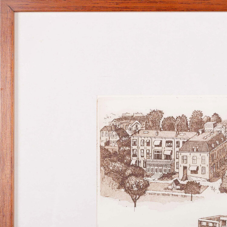 Jan Klinkenberg, Zeeweg rond 1950, Wilhelminastraat Huize st. Jeroen rond 1920, 1990. Ets in houten lijst. Charmante historisch zicht van diverse straten in Noordwijk.