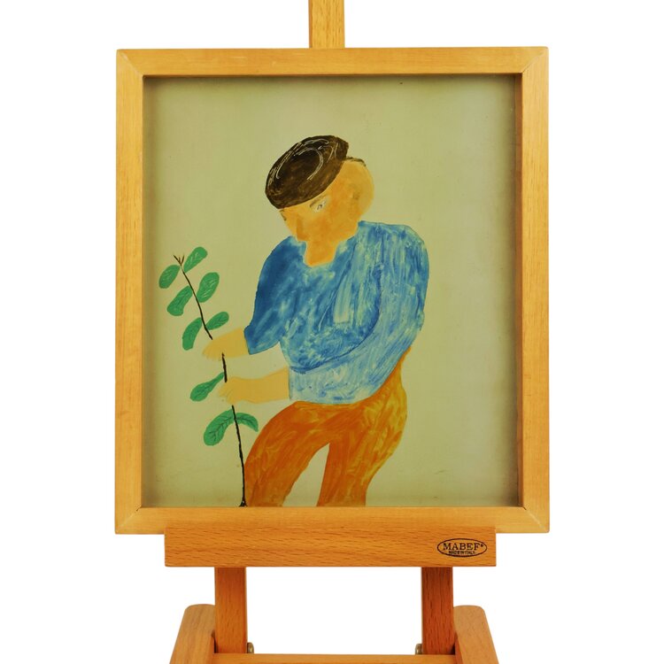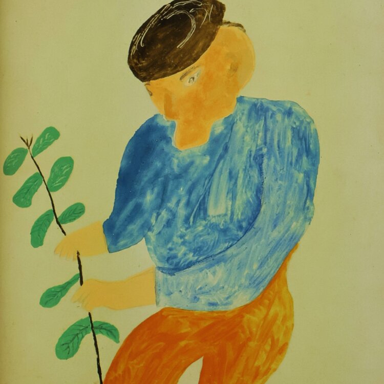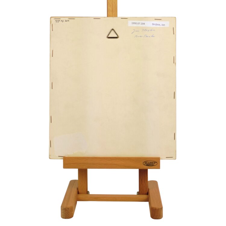 Jan Strijbos, 'Farmer Peerke', no date. Oil on panel in wooden frame. Three-quarter portrait of a man near a plant on a light background. Signature is missing. Jan (Johannes) Strijbos (Eindhoven 1896 - Merkelbeek 1977) was a carpenter. After he retired, he became a self-made painter in the naïve style and crafted the frames for his works himself. Condition: good; frame shows signs of wear. Dimensions: image plane 21.5 x 18.9 cm, with frame: 24.5 x 21.8 x 2.3 cm.