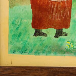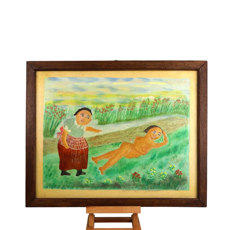 Jan Strijbos, 'Get out of here', 1960-1980. Oil on hardboard in wooden frame. Full-length portrait of a woman pointing to a nude person lying on grass. Title at bottom left. Signature at bottom right. Jan (Johannes) Strijbos (Eindhoven 1896 - Merkelbeek 1977) was a carpenter. After he retired, he became a self-made painter in the naïve style and crafted the frames for his works himself. Condition: good; frame shows signs of wear. Dimensions: image plane 40 x 50 cm, with frame 42.6 x 53 x 1 cm.