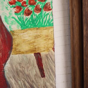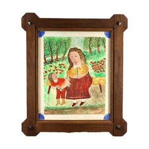 Jan Strijbos, 'Mother with child and cat on a bench, with blooming tulips in the background', 1975-1980. Oil on hardboard in a wooden frame. Full-length portrait of a woman and child sitting on a bench. Signature at bottom right. Jan (Johannes) Strijbos (Eindhoven 1896 - Merkelbeek 1977) was a carpenter. After he retired, he became a self-made painter in the naïve style and crafted the frames for his works himself. Condition: good. Dimensions: image plane 43 x 35.5 cm, with frame 55.3 x 48.2 x 1.9 cm.