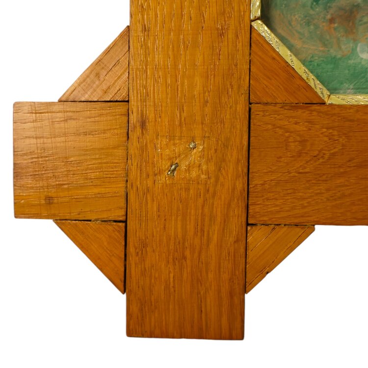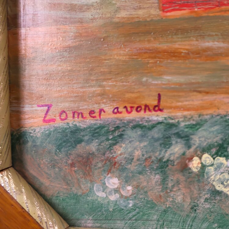 Jan Strijbos, 'Summer evening', 1968-1977. Painting in oak frame. Painting of a farmhouse under a starry sky. Title at bottom left. Signature at bottom right. Jan (Johannes) Strijbos (Eindhoven 1896 - Merkelbeek 1977) was a carpenter. After he retired, he became a self-made painter in the naïve style and crafted the frames for his works himself. Condition: good, there is a small ornament missing from the bottom left corner. Dimensions: image plane 49.5 x 59 cm, with frame 69 x 78.3 x 2.5 cm.