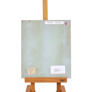 Jan Strijbos, 'Upward looking figure', 1970-1980. Oil on hardboard, unframed. Portrait of a person looking up, dressed in white and blue clothing against a grey background. Signature missing. Jan (Johannes) Strijbos (Eindhoven 1896 - Merkelbeek 1977) was a carpenter by trade and, after his retirement, a self-taught painter in the naïve style. Condition: shows signs of wear. Dimensions: 23 x 19.5 cm.