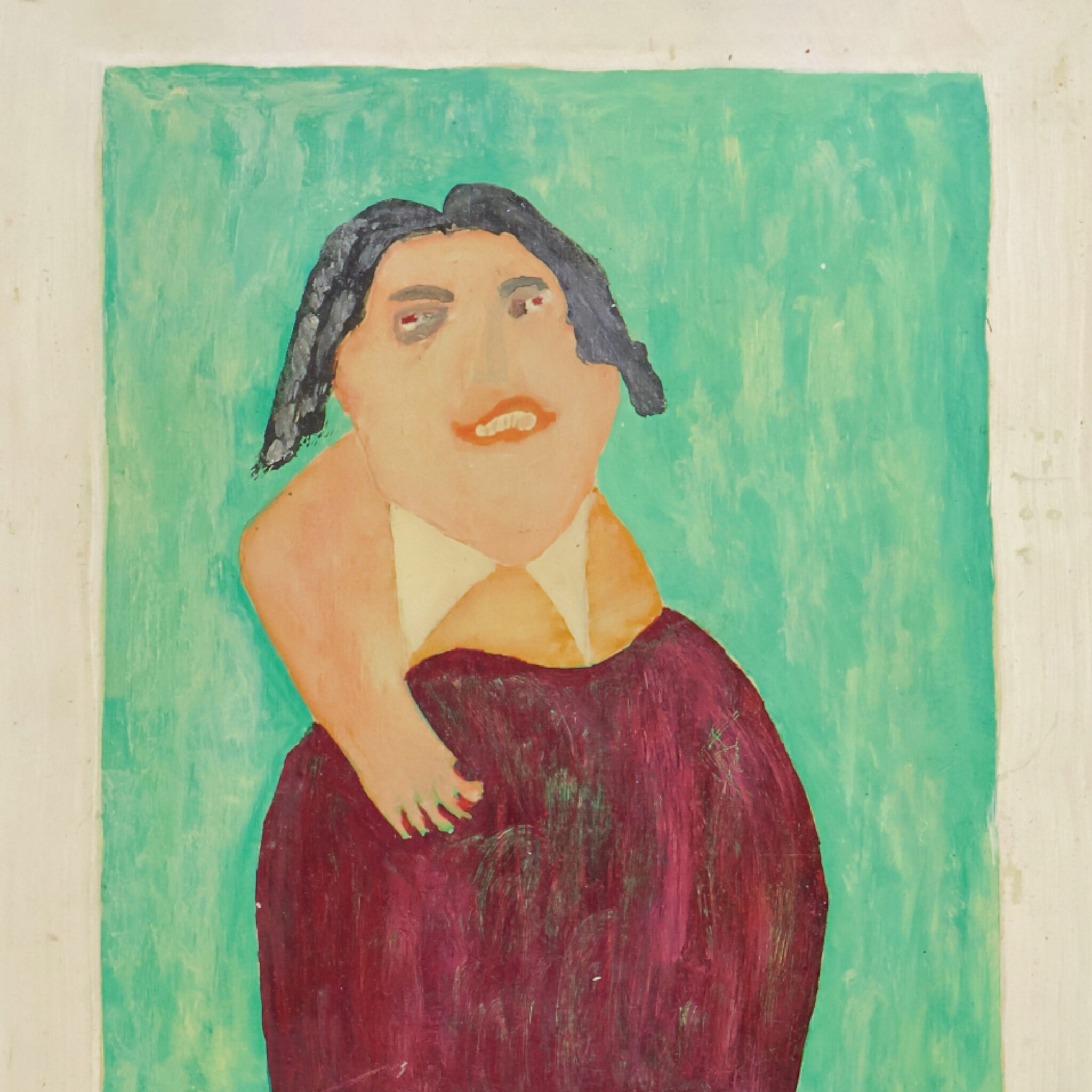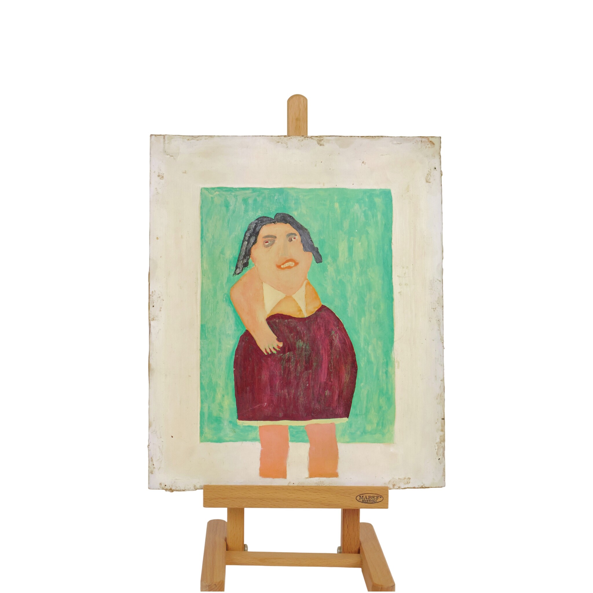 Jan Strijbos, 'Woman with red skirt', 1970-1980. Oil on plywood, unframed. Portrait of smiling woman with red skirt. Signature missing. Jan (Johannes) Strijbos (Eindhoven 1896 - Merkelbeek 1977) was a carpenter by trade and, after his retirement, a self-taught painter in the naïve style. Condition: shows signs of wear, traces of frame visible. Dimensions: image plane 31.5 x 26.5 cm.