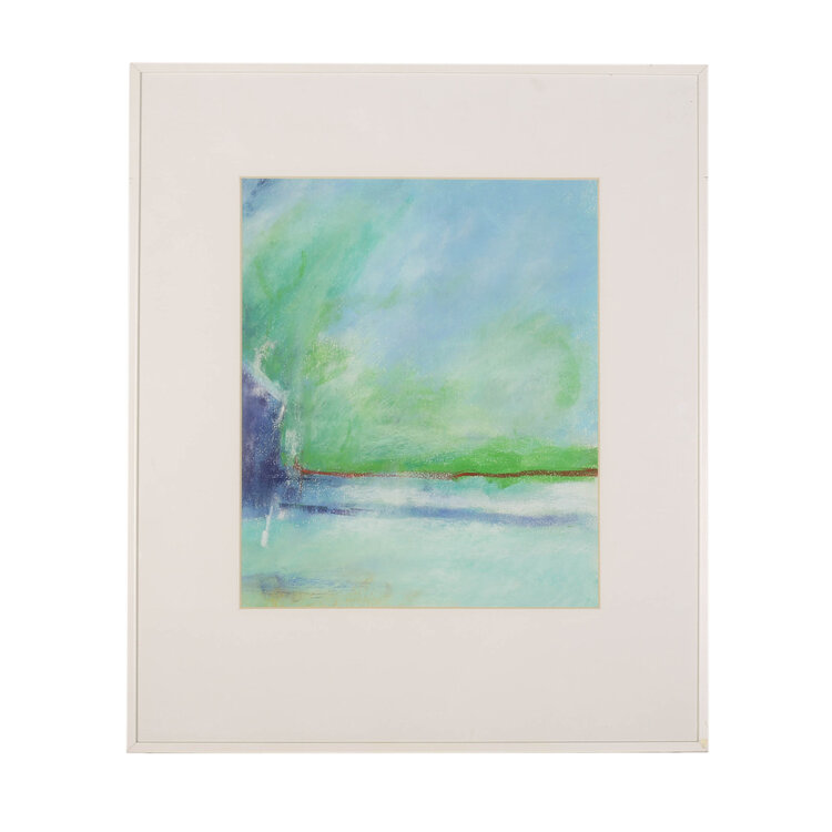 Jan Wagner, Frans Landschap, jaartal onbekend. Pastelkrijt op papier in wit metalen lijst. Kleurrijke abstracte voorstelling in groen en blauw met een horizontale bruine streep. Signatuur linksonder. Conditie: goed, gebruikssporen aan lijst. Afmeting lijst: 61 x 51 cm.