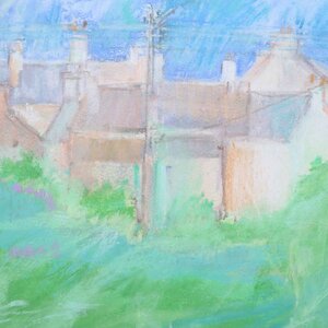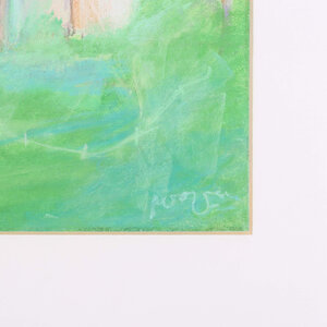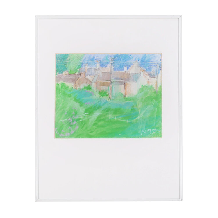 Jan Wagner, Pointe de Trévignon, jaartal onbekend. Pastel op papier in wit metalen lijst. Kleurrijke voorstelling van een dorpsgezicht met op de voorgrond groene natuur. Signatuur rechtsonder. Conditie: goed, gebruikssporen aan lijst. Afmeting werk zonder lijst: 23 x 30 cm; incl. lijst: 51 x 41 cm.