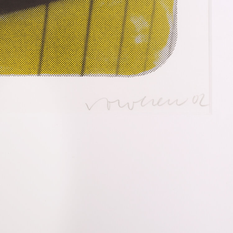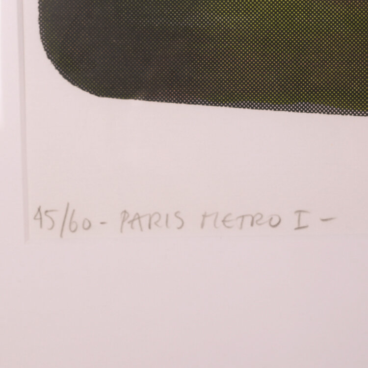Jelis van Dolderen, Paris Metro I, 2002. Zeefdruk op papier in metalen lijst, oplage 45/60. Afbeelding van een metro hal in geel bewerkt met accenten in rood. Linksonder oplagenummer en titel, rechtsonder signatuur en jaar. Conditie: gebruikssporen aan lijst. Afmeting werk zonder lijst: 57 x 76 cm.