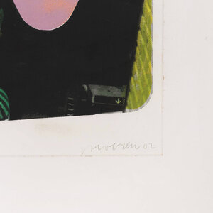 Jelis van Dolderen, Paris Metro VI, 2002. Zeefdruk op papier in metalen lijst, oplage 45/60. Afbeelding van een metro hal in groen bewerkt met accenten met geometrische kleurrijke vormen. Linksonder oplagenummer en titel, rechtsonder signatuur en jaar. Conditie: gebruikssporen aan lijst. Afmeting werk zonder lijst: 57 x 76 cm; incl. lijst: 72,5 x 92 cm.
