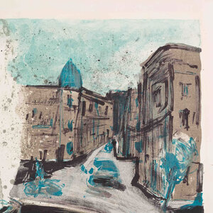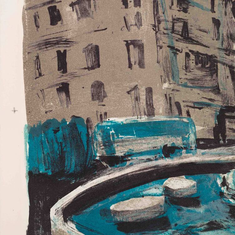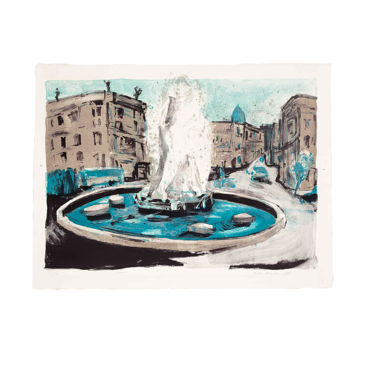 Jeroen Hermkens, Wenen, 1989. Litho op papier zonder lijst, oplage 10/26. Afbeelding van een straatbeeld in Wenen, met gebouwen en een rotonde om een fontein. Ook zijn schetsmatige weggebruikers zichtbaar. Het werk is gedrukt in de kleuren zwart, bruin en blauw. Rechtsonder signatuur. Conditie: het papier toont hier en daar gebruikssporen, zoals verkleuring en vlekken op de rand om de afbeelding, aan de achterkant resten van tape. Afmeting papier: 56 x 76 cm.