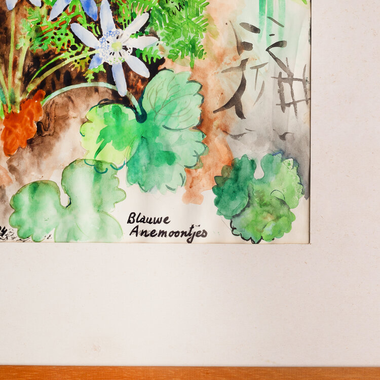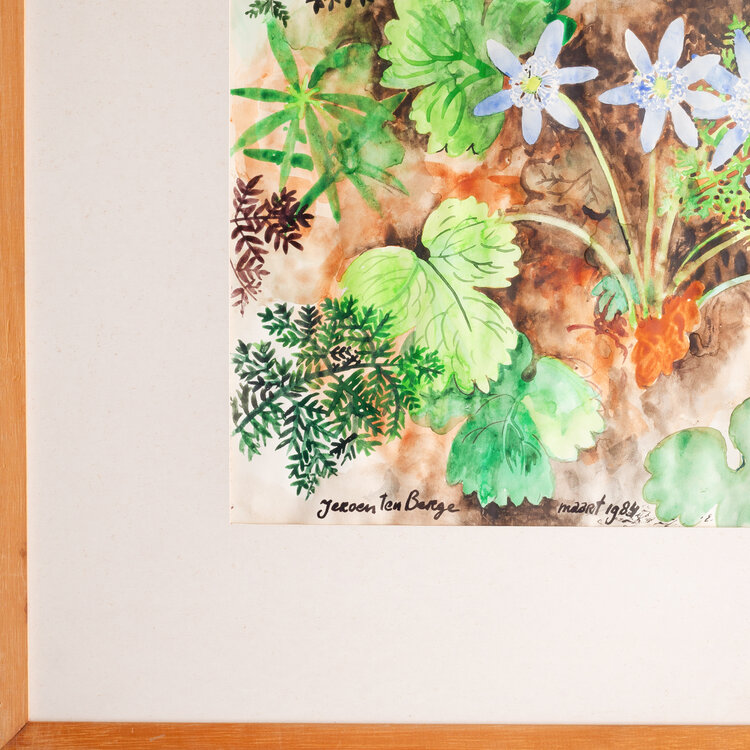 Jeroen ten Berge (Haarlem, 1939), 'Blauwe anemoontjes'. Aquarel van blauwe anemoontjes, omringd door groen blad, in houten lijst. Signatuur linksonder. Datering: 1984. Conditie: Lijst is licht beschadigd, vlekken op passe-partout, papier van de aquarel bobbelt. Afmetingen lijst: 50 x 62,5 cm; beeldvlak: 28,5 x 40,5 cm.