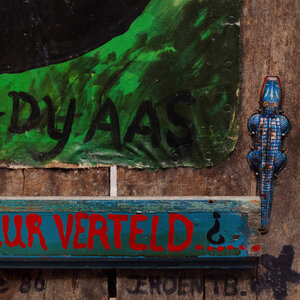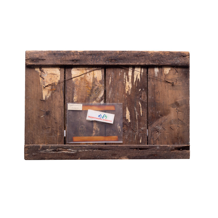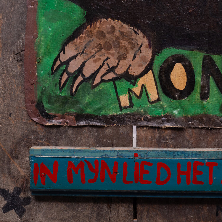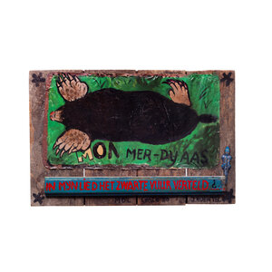 Jeroen ten Berge (Haarlem, 1939), 'Mol' Een schildering op een stuk textiel dat vastgezet is met spijkers op houten planken. Afbeelding van een mol in het gras met de tekst "In mijn lied het zwarte vuur verteld..." Aan de rechterkant is een krokodil van blik met spijkers bevestigd. Signatuur rechtsonder. Datering 1986. Conditie: kleine beschadigingen aan het verfwerk. Afmetingen: 43 x 65 cm.