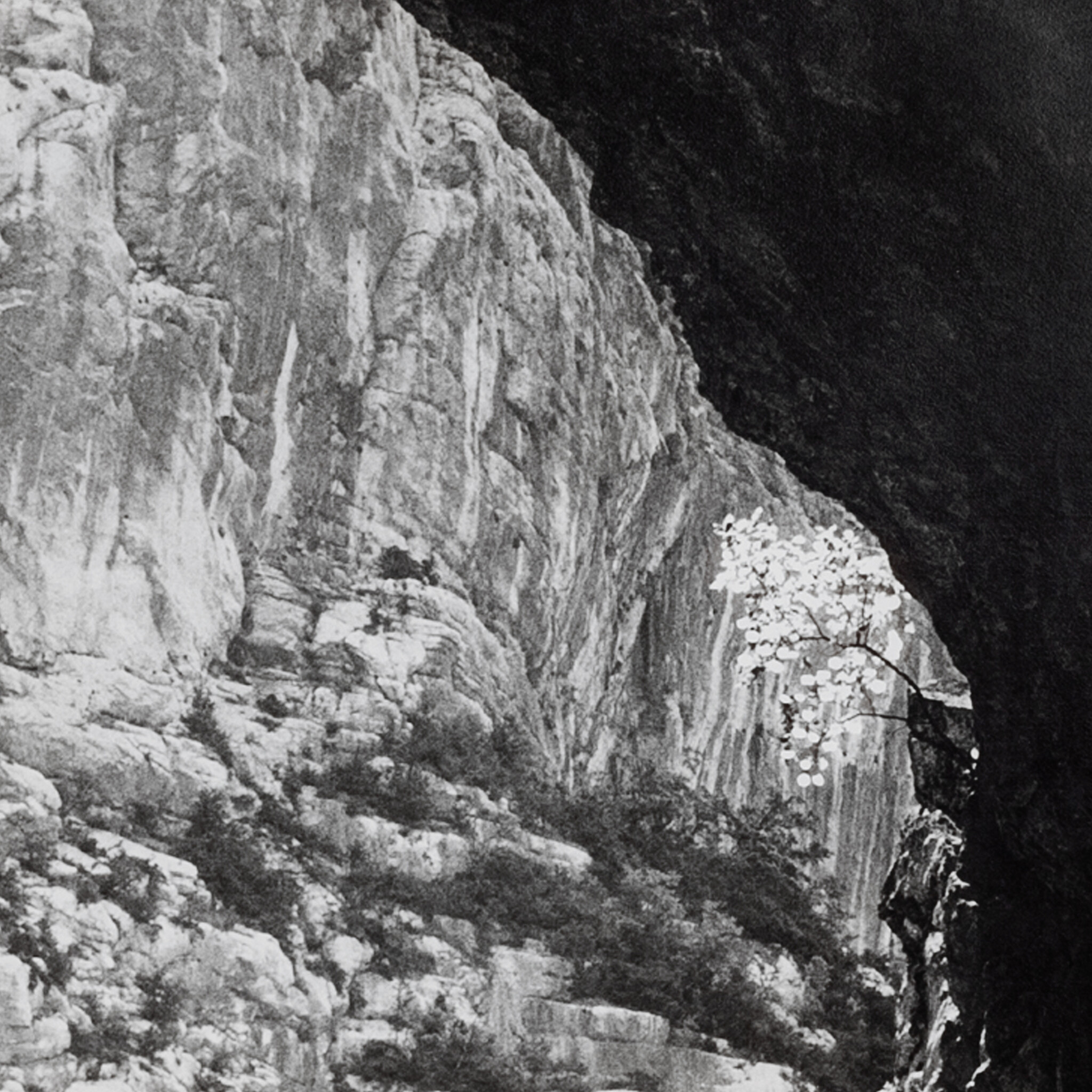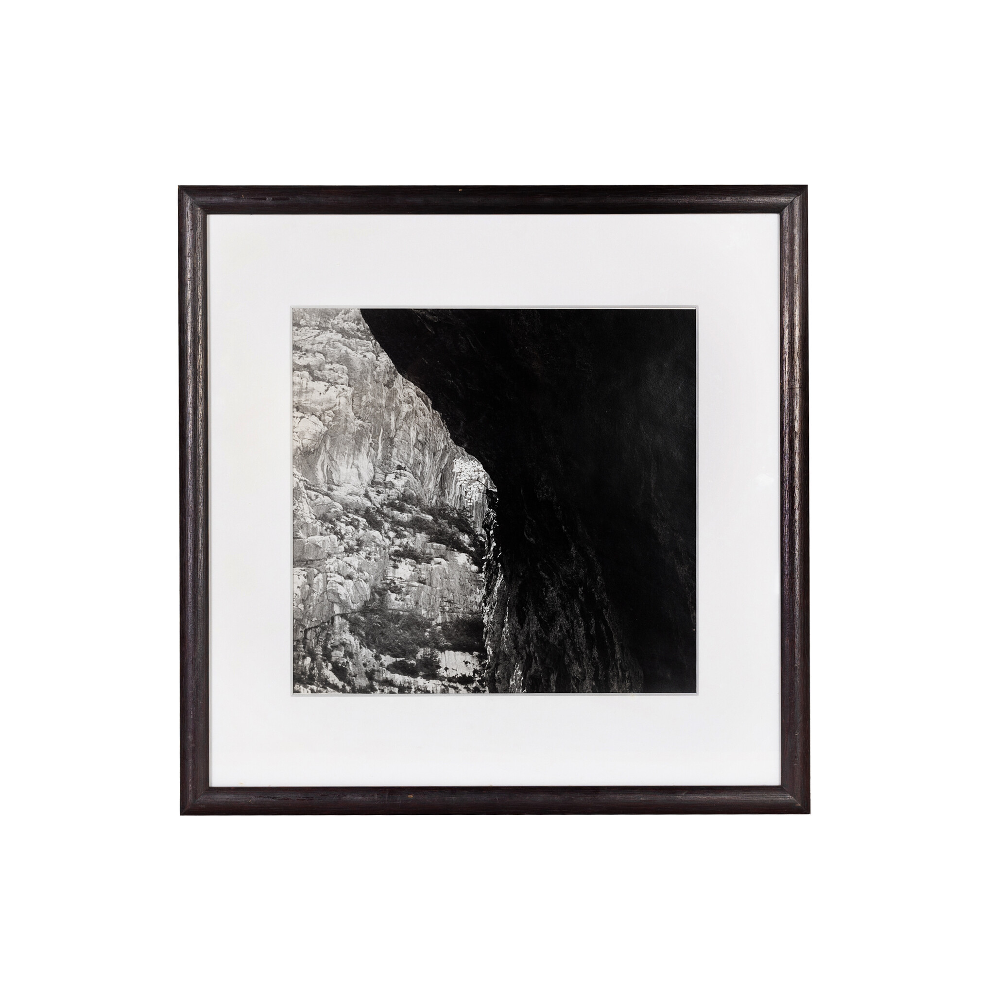 Jirina Simajchlova, 'Hoop'. Zwart-witfoto van een rotslandschap, in donkerbruin houten lijst met passe-partout. Datering onbekend. Conditie: gebruikssporen lijst. Afmetingen lijst: 43 x 43 cm; beeldvlak: 26,5 x 27,5 cm.
