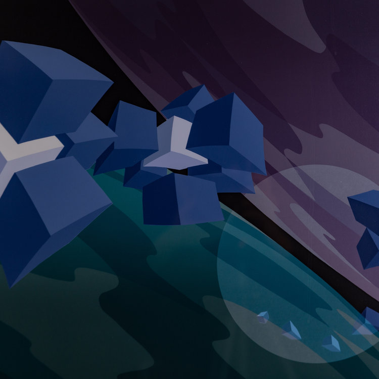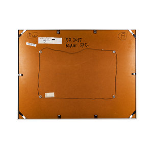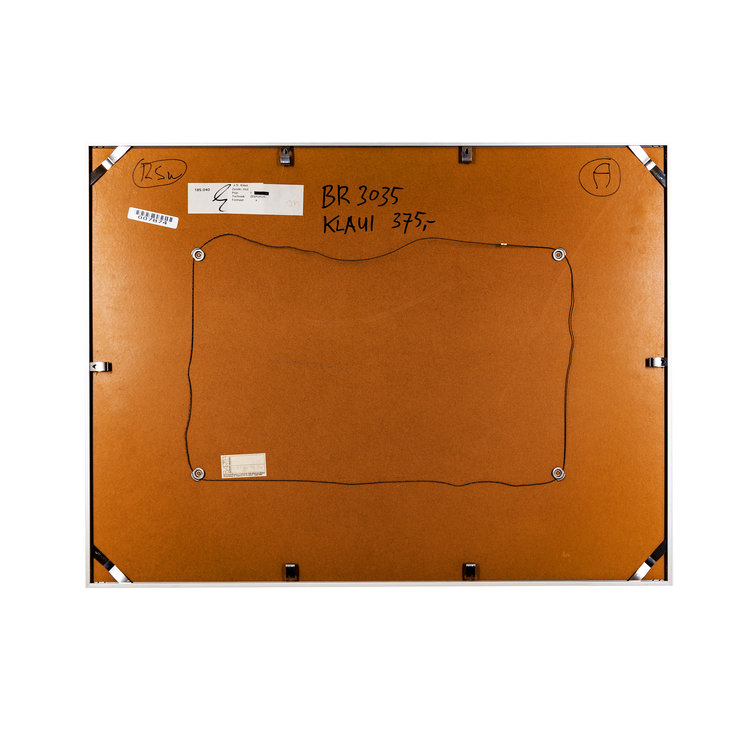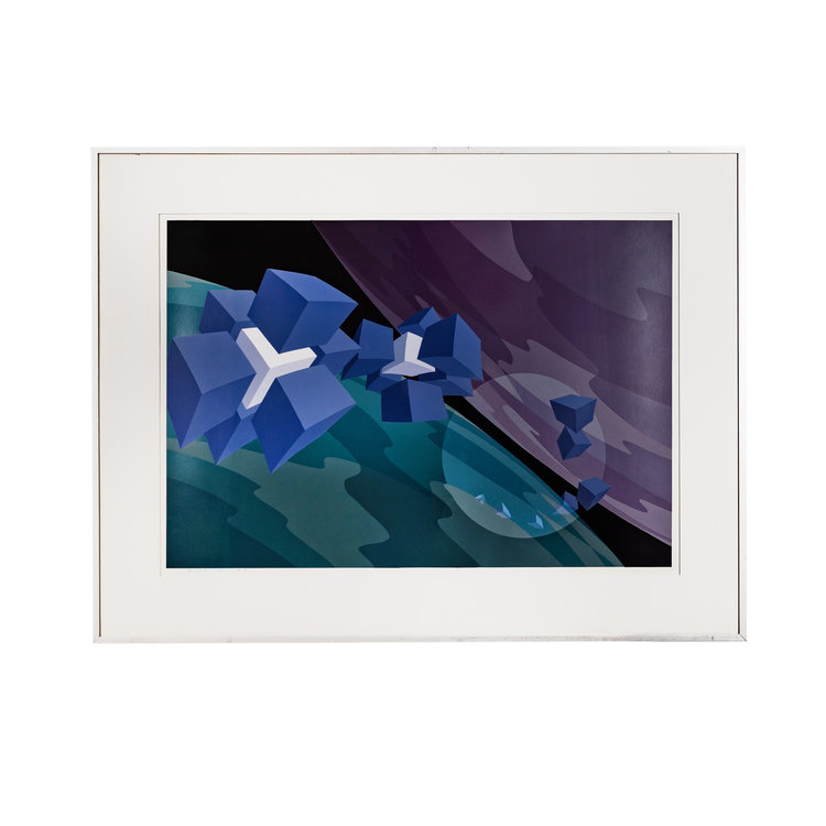 J.S. Klaui, Zonder titel, 1987. Zeefdruk op papier in metalen lijst, E.A. Abstracte voorstelling van blauwe en witte kubus vormen voor twee planeet-lijkende cirkels. Conditie: goed, gebruikssporen aan lijst. Afmeting werk zonder lijst: 43 x 63 cm.