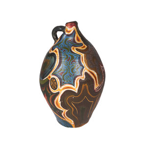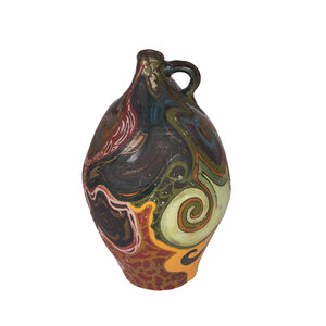 Gres kruik met oor en pauwenveren. De kruik is beschilderd met organische vormen in verschillende kleuren, waaronder bruin, blauw, groen en rood. Datering onbekend. Conditie: vertoont sporen van gebruik, de verf heeft beschadigingen en is op verschillende plekken afgesleten. Afmetingen: ca. 45 x Ø25 cm.