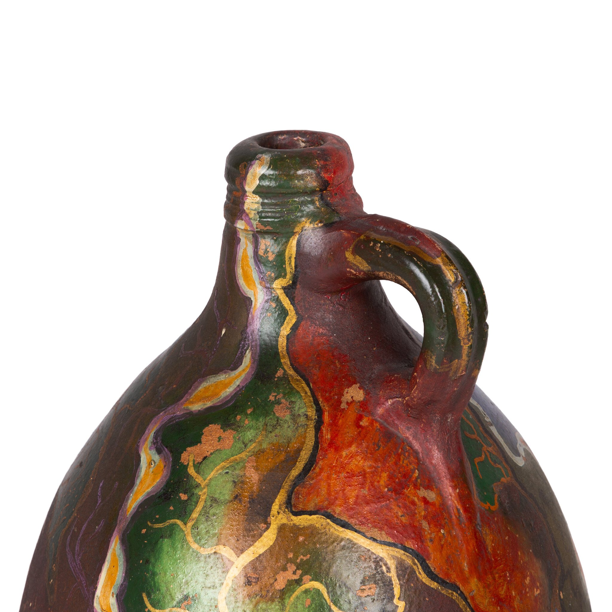 Gres kruik met oor en pauwenveren. De kruik is beschilderd met organische vormen in verschillende kleuren, waaronder bruin, blauw, groen en oranjerood. Datering onbekend. Conditie: vertoont sporen van gebruik, de verf heeft beschadigingen en is op verschillende plekken afgesleten. Afmetingen: ca. 36,5 x Ø19 cm.