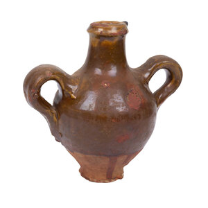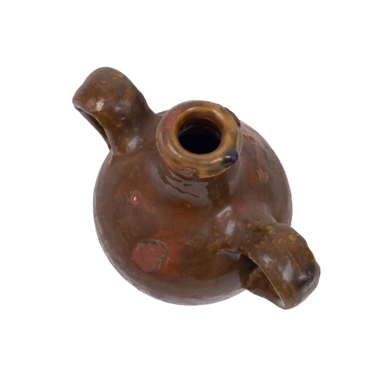 Kruik van aardewerk. De bruine kruik is deels geglazuurd, heeft twee oren en is handgemaakt. Mogelijk een bodemvondst. Datering onbekend. Conditie: kleine beschadgingen, verder sporen van ouderdom en gebruik. Afmetingen: ca. 15 x 16 x 11 cm.