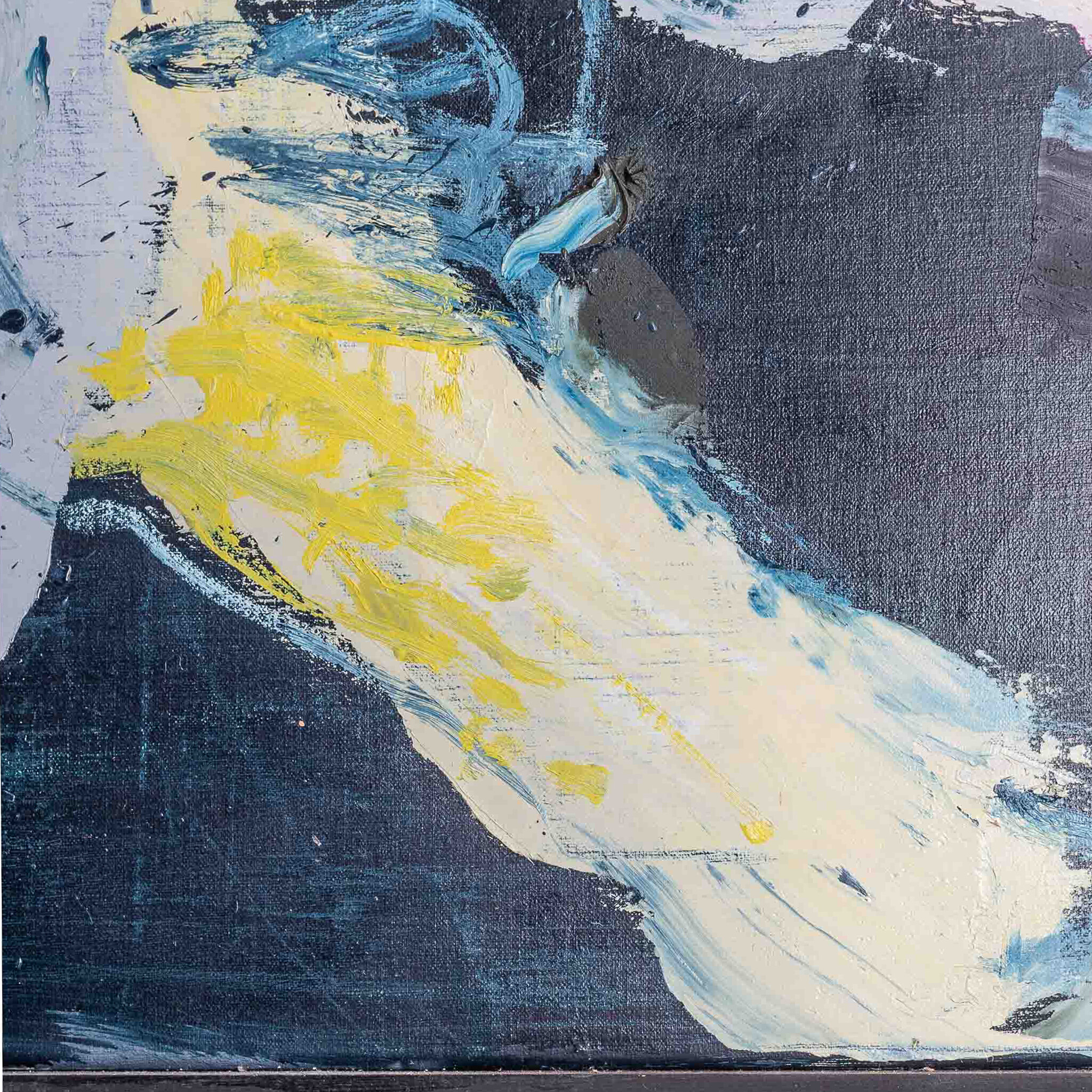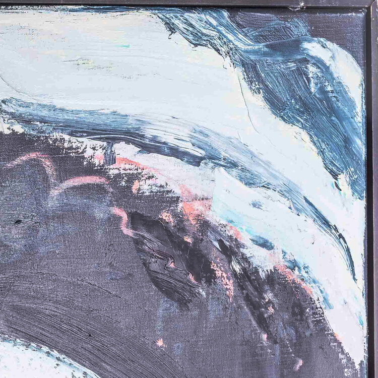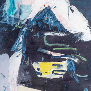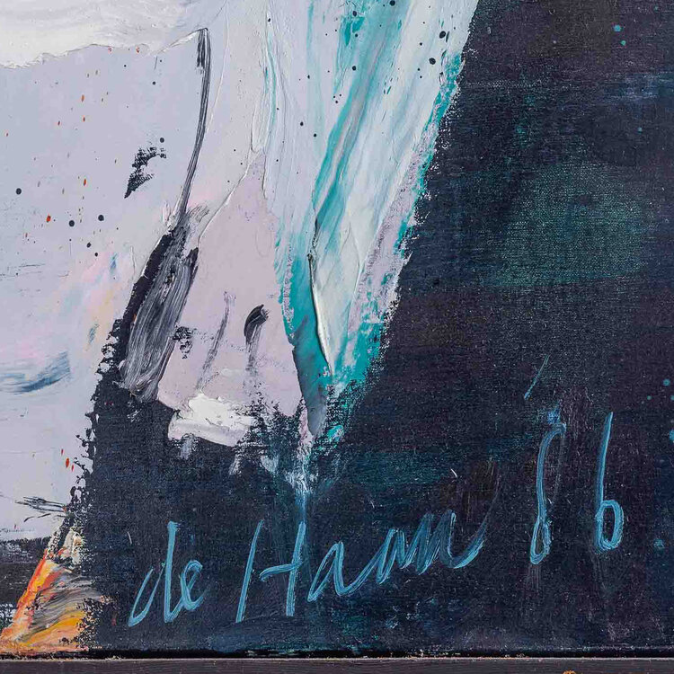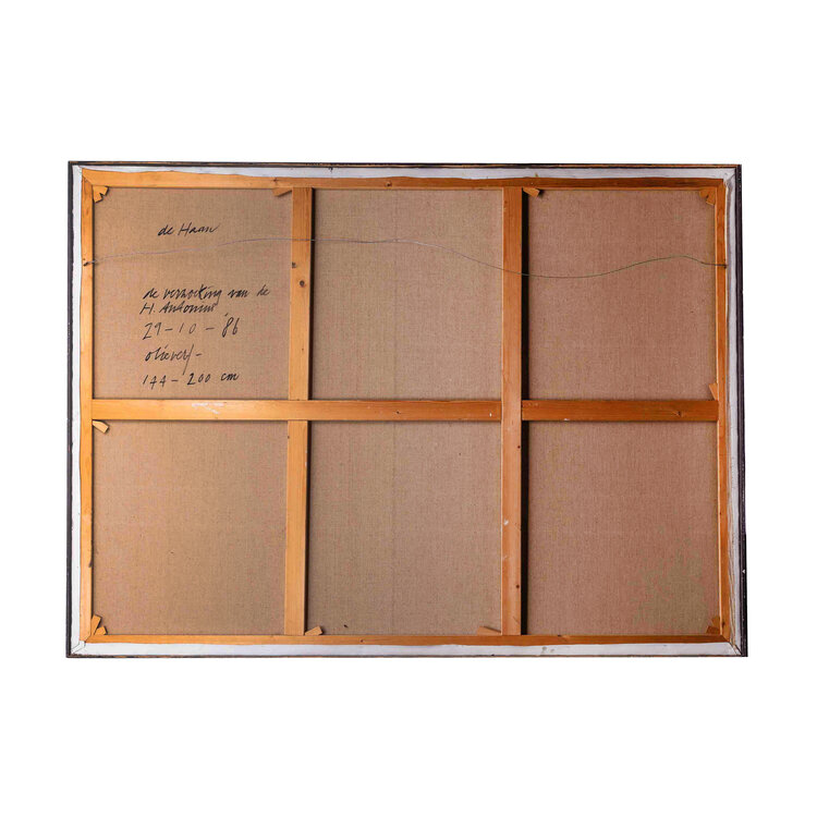 Jurjen de Haan, 'De verzoeking van de H. Antonius', 29-10-1986. Olieverf op doek in zwart houten omlijsting. Abstracte compositie van pastel-kleurige figuren voor een donkere achtergrond. Aan de achterzijde gesigneerd met titel, datum en afmetingen. Conditie: goed, hooguit wat lichte gebruikssporen aan de lijst. Afmeting doek: 144 x 200 cm.