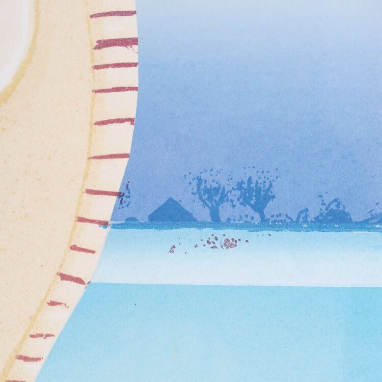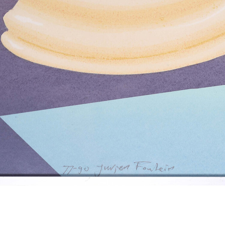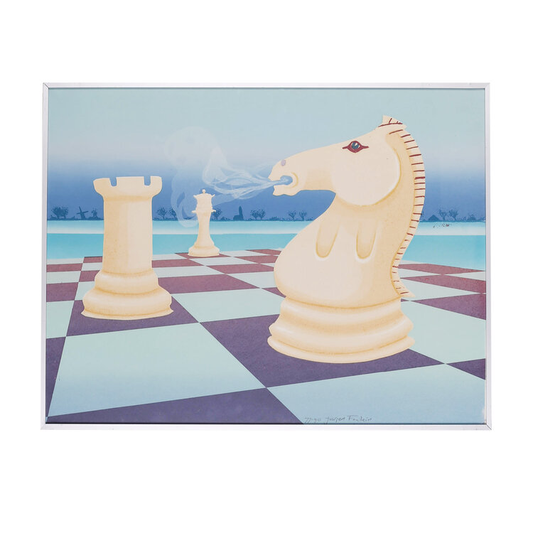 Jurjen Fontein, Schaak, jaartal onbekend. Zeefdruk op papier in metalen lijst, oplage 77/90. Close-up van een schaakbord met wit paard, toren en koningin. Het paard blaast lucht uit. Onderaan signatuur oplagenummer. Conditie: goed, gebruikssporen aan lijst. Afmeting werk zonder lijst: 49 x 64 cm.