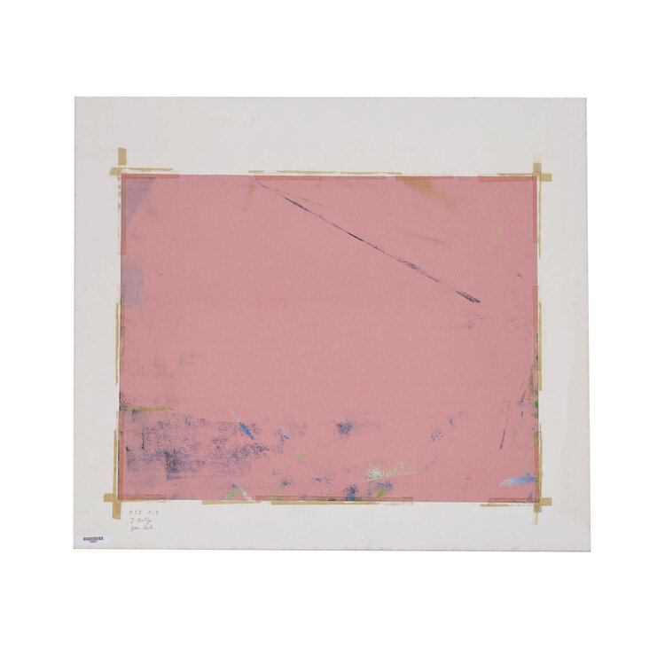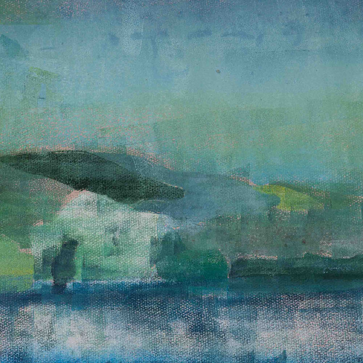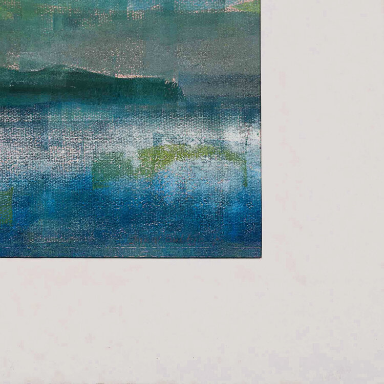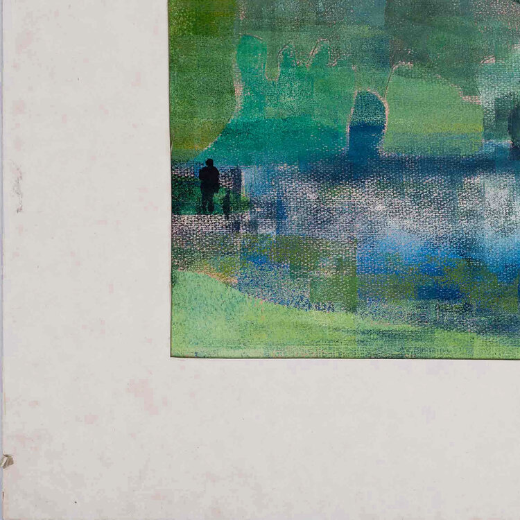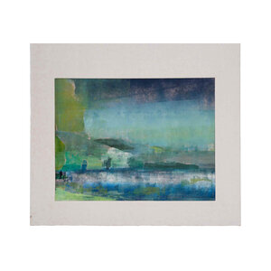 J.W. Bultje, Kastoria (Griekenland), 1997. Gemengde technieken op papier in passe-partout zonder lijst. Een geabstraheerd werk van een landschap in groen en blauw. Signatuur rechtsonder. Conditie: het papier toont gebruikssporen, kleine beschadigingen op het werk en op het passe-partout. Afmeting inclusief passe-partout: 80 x 70 cm.