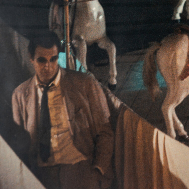Karel de Boer, Faust; Mephisto in het dorp, jaartal onbekend. Kleurenfoto in metalen lijst. Foto van een man voor een draaimolen. Conditie: goed, gebruikssporen aan lijst. Afmeting foto: 41 x 60 cm, incl. lijst: 80 x 70,5 cm.
