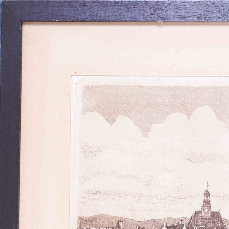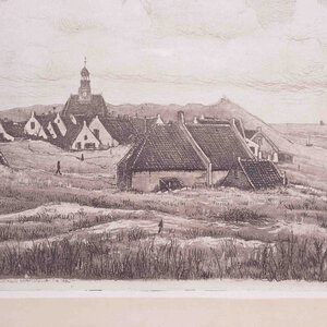 Karel Kok, Noordwijk aan zee vanaf voormalige Seinpostduin ca. 1880, 1978. Ets, rechthoekig in bruin en wit in passepartout in rechte lijst achter glas. Voorstelling Noordwijk aan zee vanaf voormalige Seinpostduin ca. 1880. Dorp met kerktoren. Op het strand bomschuiten. Rechtsonder signatuur. Conditie: lijst toont lichte gebruikssporen, passe-partout verkleurd en onderaan wat waterschade. Afmetingen: 38 x 43 cm.