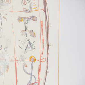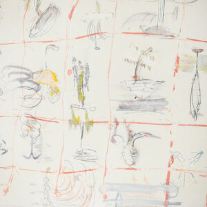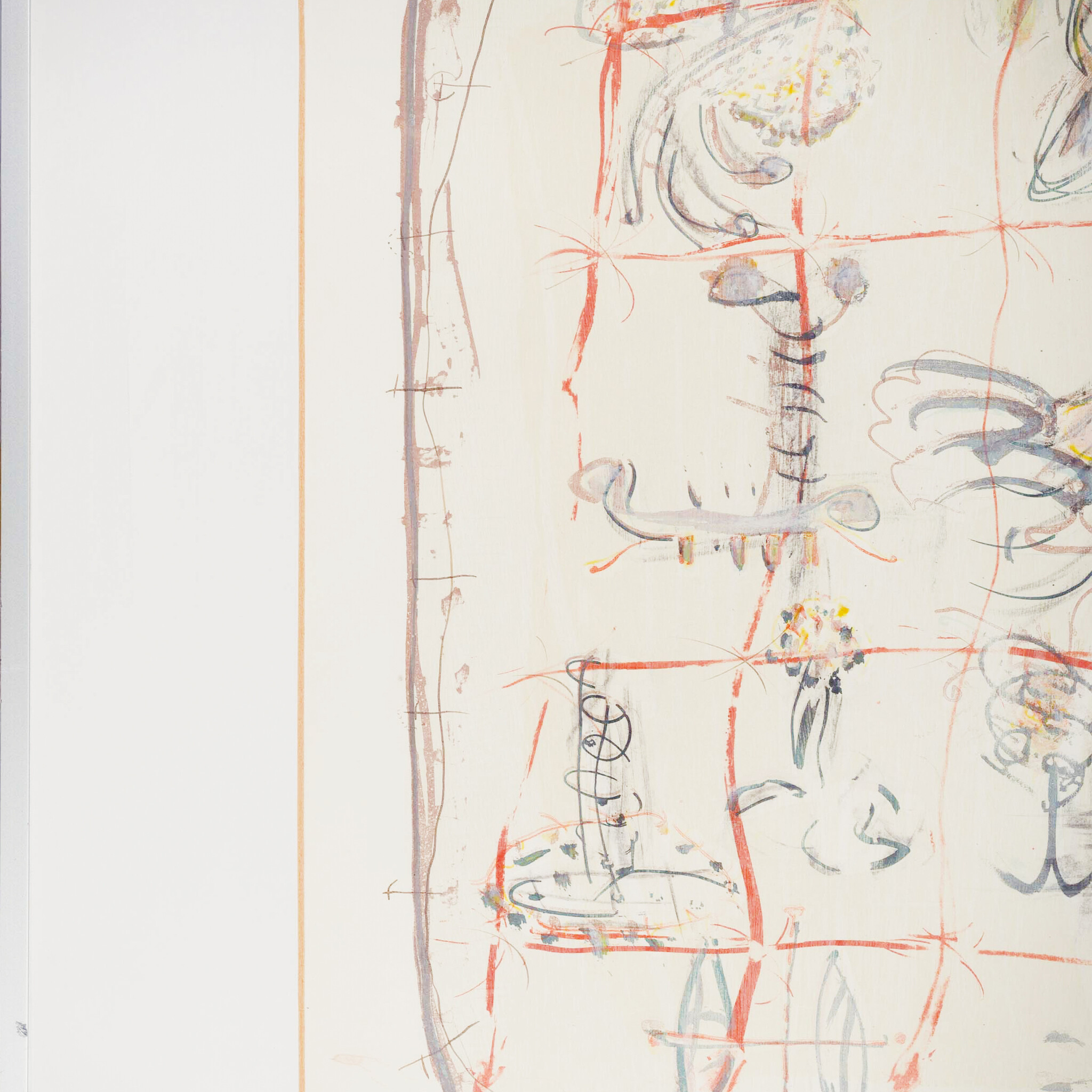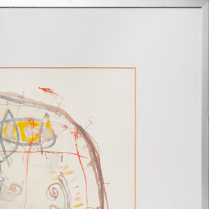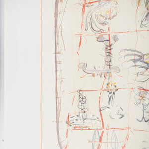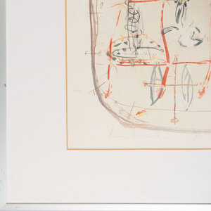 Kees Landa, 'Zoological', 1992. Steendruk, houtsnede, tekening met passe-partout in metalen lijst met kunststof plaat. Het abstracte werk bestaat uit verschillende kleine afbeeldingen in vakjes in de kleuren rood, geel en groen. Signatuur linksonder. Conditie: vertoont gebruikssporen. Afmetingen incl lijst: ca 84,5 x 111 x 2 cm.
