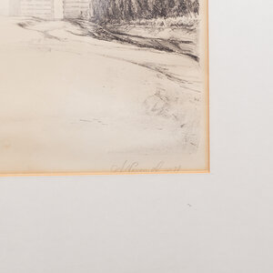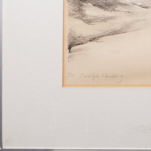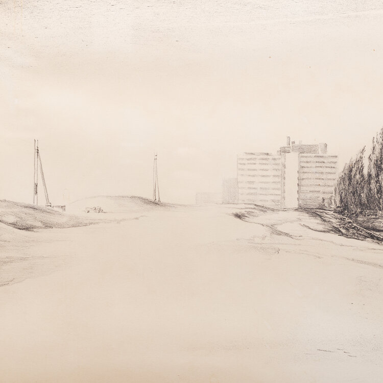 Kees Nevenzel (Amsterdam, 1951), 'Zuidelijke Wandelweg', 1978. Litho in metalen lijst met passe-partout, oplage 7/10. Tekening van een weg met in de verte een flatgebouw in zwart en wit. Signatuur rechtsonder. Conditie: verkleuring papier, lijst vertoont gebruikssporen, taperesten op glas. Afmetingen: lijst 50,5 x 65,5 cm; beeldvlak 29 x 44 cm.