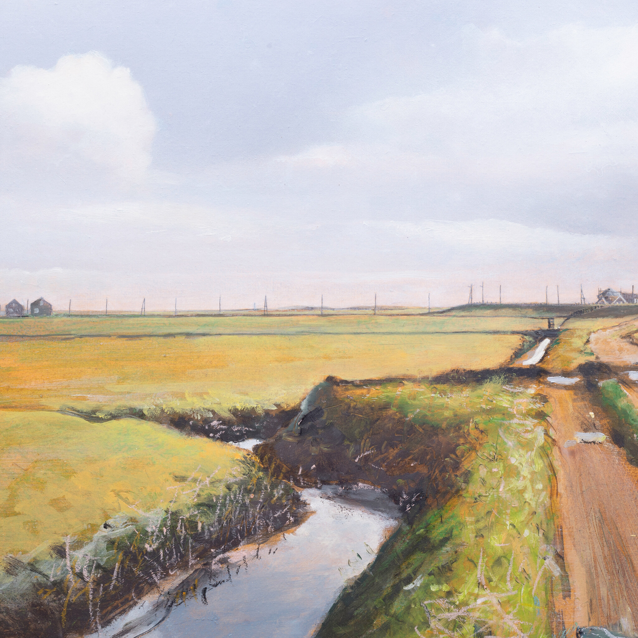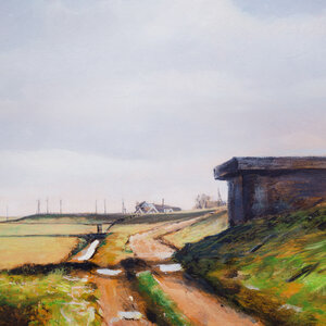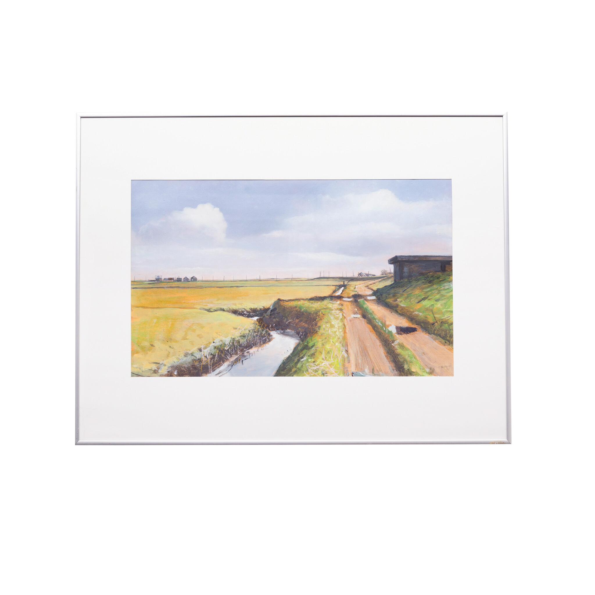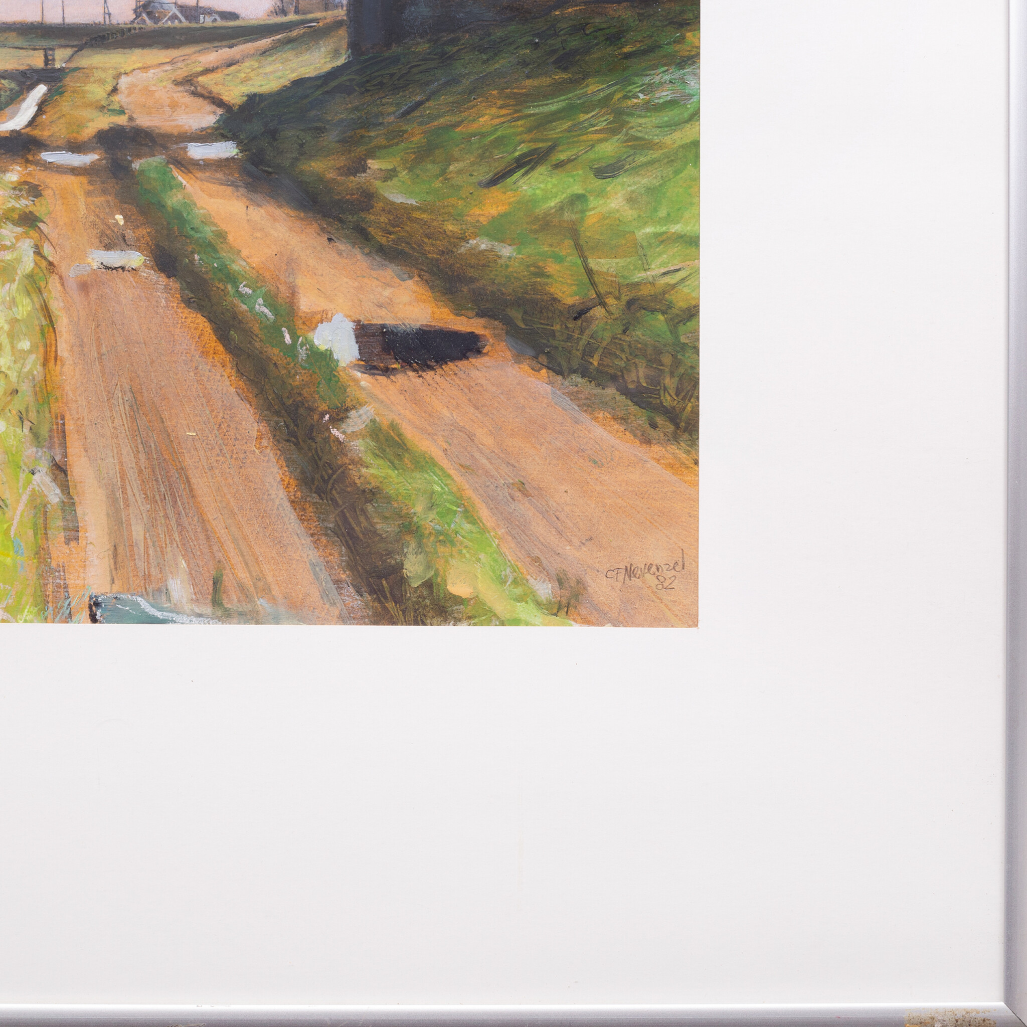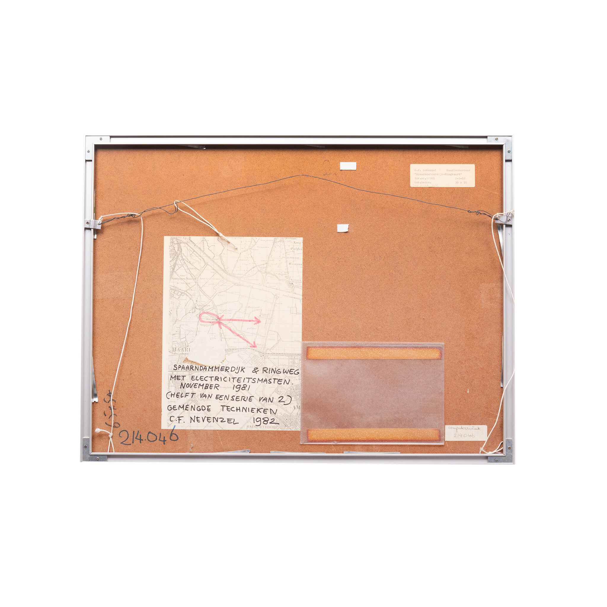Kees Nevenzel (Amsterdam, 1951), 'Spaarndammerdijk & Ringweg'. Gemengde technieken met verschillende soorten verf in metalen lijst met passe-partout. Afbeelding van een weiland met karrenspoor en sloot. In de verte staan elektriciteitsmasten. Achterop staat geschreven: "Spaarndammerdijk & Ringweg met electriciteitsmasten. Novemver 1981. (Helft van een serie van 2)". Signatuur rechtsonder. Datering: 1982. Conditie: gebruikssporen lijst, zoals resten van stickers. Afmetingen lijst: 50,5 x 65,5 cm; beeldvlak: 30 x 48 cm.