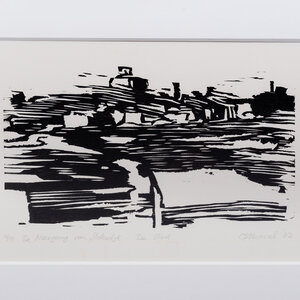 Kees Nevenzel (Amsterdam, 1951), 'De Neergang van Sloterdijk - De Stad', 1982. Houtsnede in metalen lijst met passe-partout, oplage 4/10. Stilistische voorstelling van een stad in zwart en wit. Signatuur rechtsonder. Conditie: lijst vertoont gebruikssporen, taperesten op glas. Afmetingen: lijst 40,5 x 50,5 cm; beeldvlak 14 x 21 cm.