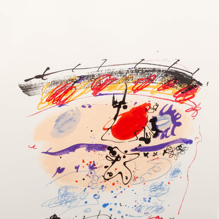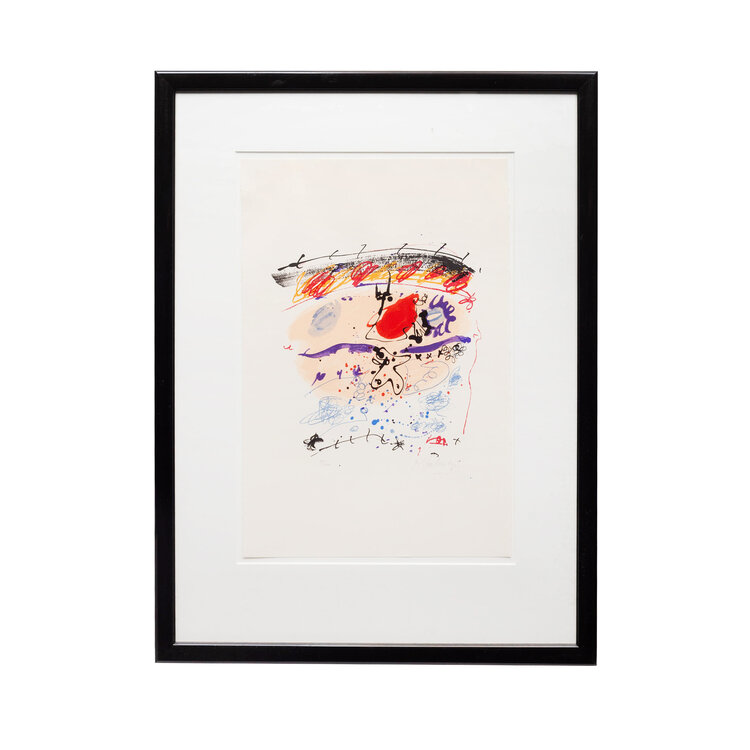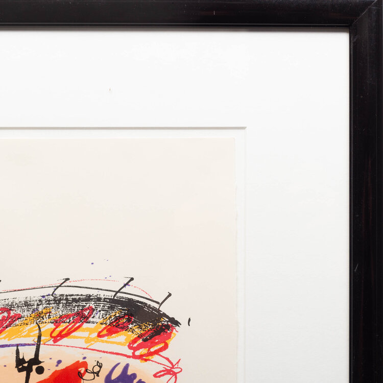 Kees Salentijn, Compositie, jaartal onbekend. Zeefdruk oplage 35/100. Abstracte voorstelling in zwart, rood, blauw, paars en geel. Linksonder oplagenummer, rechtsonder signatuur. Het werk is ingelijst in passe partout achter museumglas. Conditie: goed, enkel lichte gebruikssporen aan de lijst. Afmeting: 71 x 53 cm.